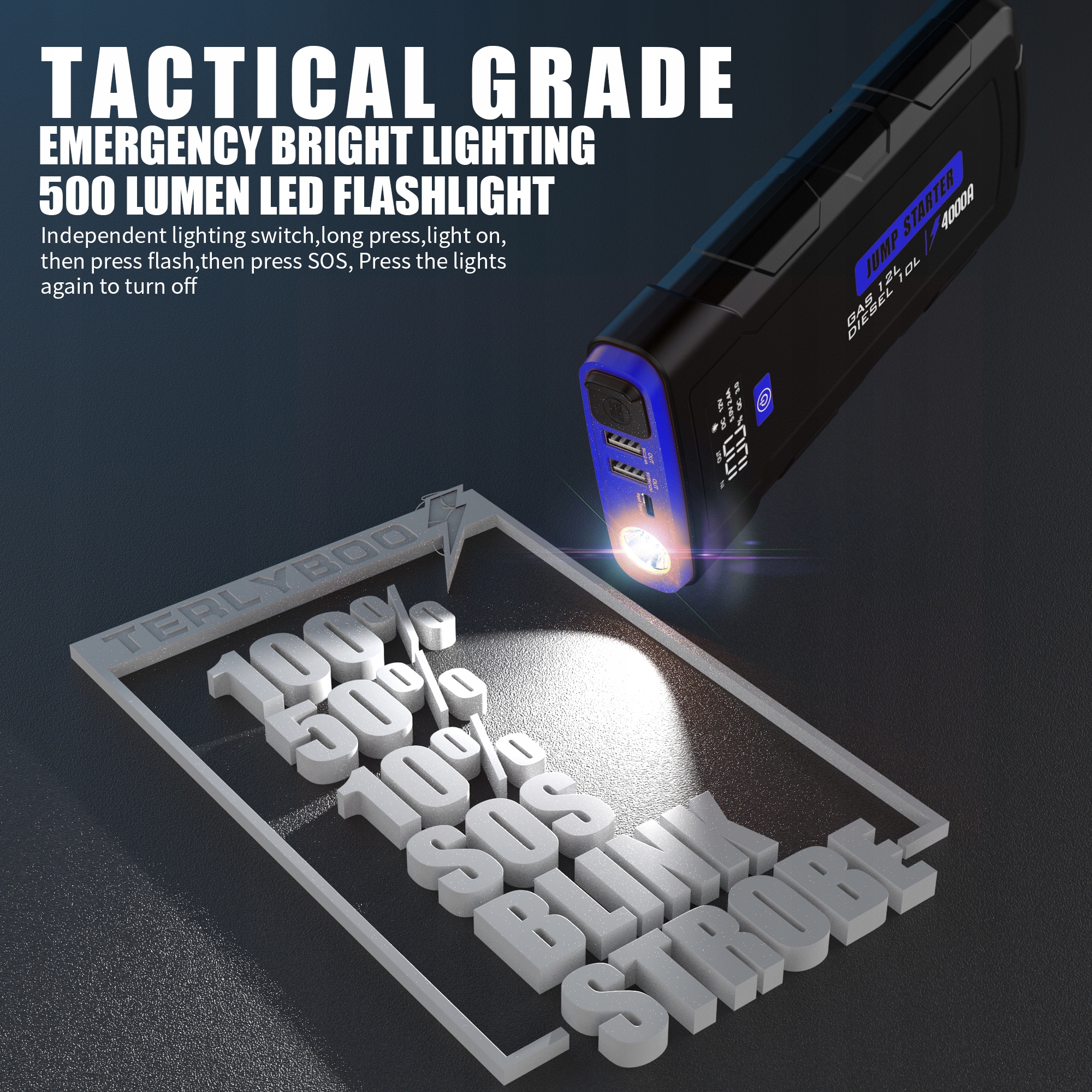 Оснащений ліхтариком на 500 люменів, який допоможе правильно прикріпити затискачі до клем в автомобілі чи іншому транспортному засобі в несприятливих умовах.