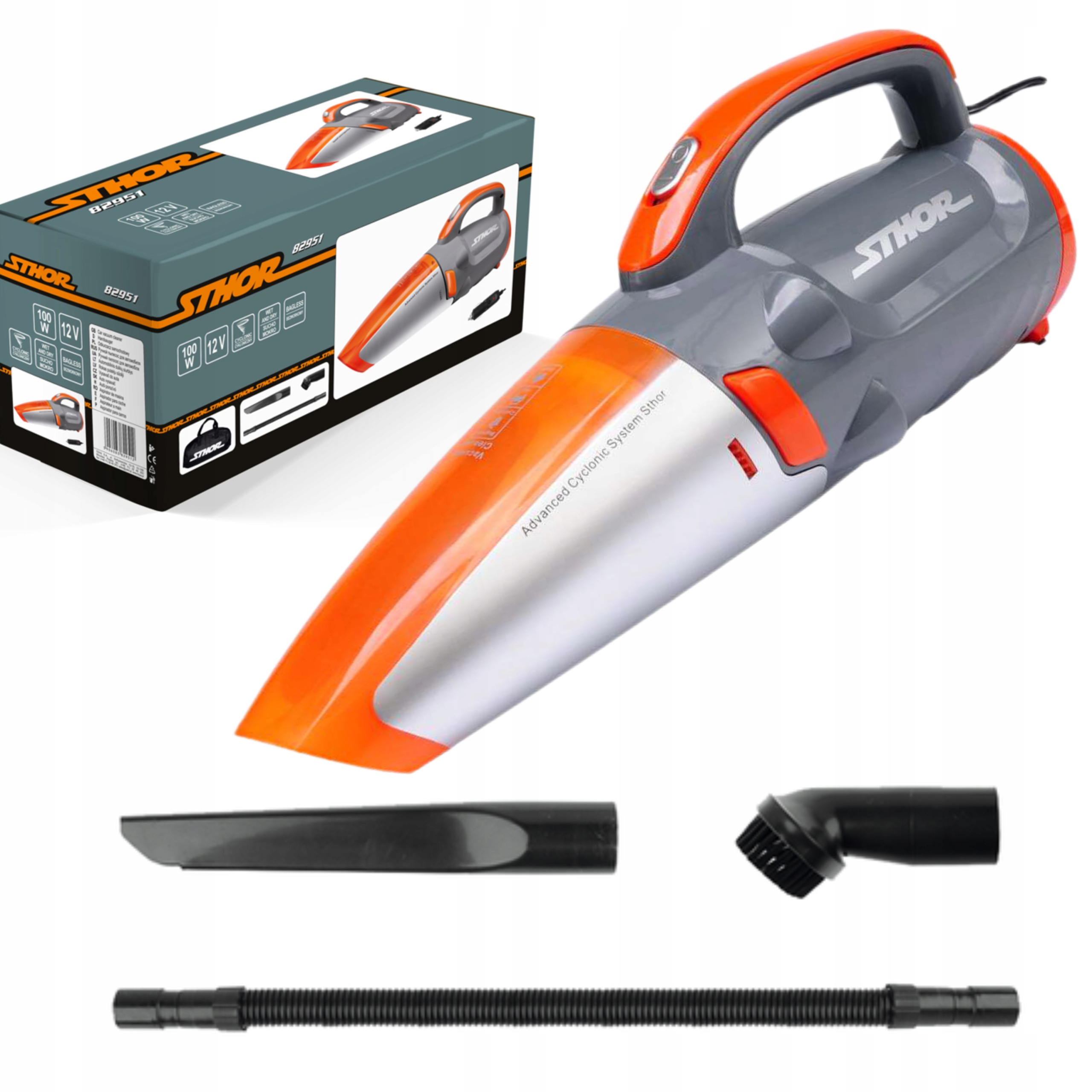Циклонний ручний пилосос для автомобіля Sthor. - Двигун 100 Вт - вакуум 3,0 кПа - живлення від автомобільної розетки 12 В - без мішка - фільтр HEPA - можливість очищення фільтра HEPA під проточною водою. - циклонна функція відсмоктування пилу, що захищає фільтр - гнучкий шланг довжиною 70 см - щілинна насадка - кругла насадка для оббивки - мішок для матеріалів для зберігання пристрою - кабель живлення 2,6 м з вилкою 12 В і контрольним діодом Призначений для регулярного чищення автомобіля салон від пилу, піску, дрібних камінчиків, крихт і т. д. Щоб запобігти розрядці акумулятора автомобіля, рекомендується використовувати пристрій після включення двигуна автомобіля. - пилосос - гнучкий шланг - вузький наконечник - оббивний наконечник - фільтр - тканинний мішок