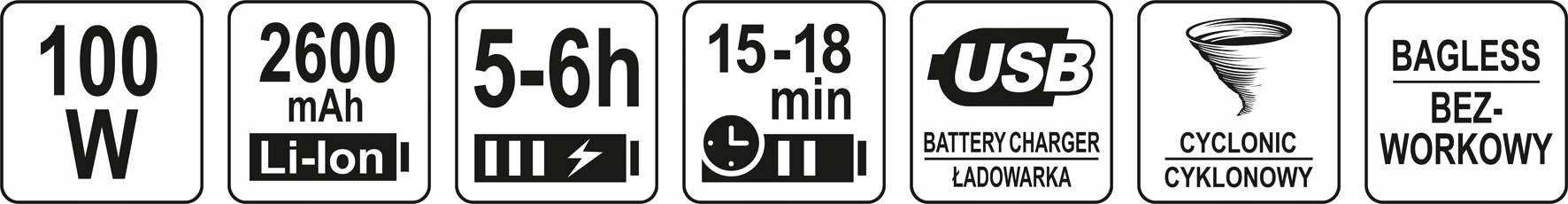 Автомобільний пилосос із потужністю 100 Вт і дуже високим тиском вакууму 5,5 кПа, рідко зустрічається в бездротових моделях. Аксесуари, що входять в комплект, полегшать ретельне очищення автомобіля, в тому числі у важкодоступних місцях і кутах. У набір входить, серед іншого, автоматична щітка TURBO, яка вирізняє пилосос на ринку. Металевий фільтр HEPA гарантує ефективну фільтрацію повітря та зменшення забруднення. Ефективний Li-Ion 2600mAh акумулятор забезпечує безперервну роботу до 15-18 хвилин. Ідеально підходить для пилососу легкових і вантажних автомобілів, а також як додатковий пилосос для дому.