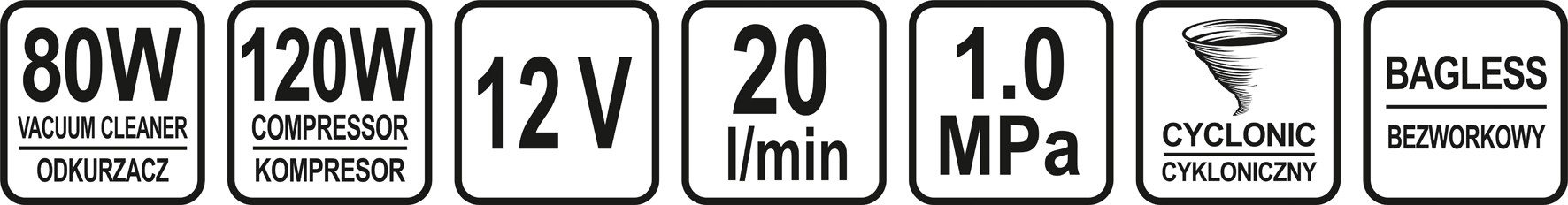 вільно вакуумний очищувач та ефективний автомобільний компресор в одному. Циклонна система забезпечує ретельне пилосос різних видів поверхонь, включаючи Оббивка та склоочисники. Оснащений фільтром HEPA, це гарантує ефективну фільтрацію повітря та зменшення забруднення. Додані аксесуари сприятимуть комплексному пилососу автомобіля, також у важкодоступних місцях. Світлодіодна лампа сприятиме роботі пристрою після темного