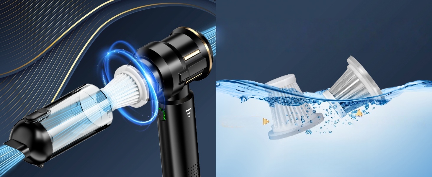 Його також можна використовувати повторно після очищення та сушіння. Комплект автомобільного ручного пилососа містить 2 фільтри (1 тонкий сталевий фільтр, 1 тканинний фільтр) для підтримки потужності всмоктування та продовження терміну служби пилососа.