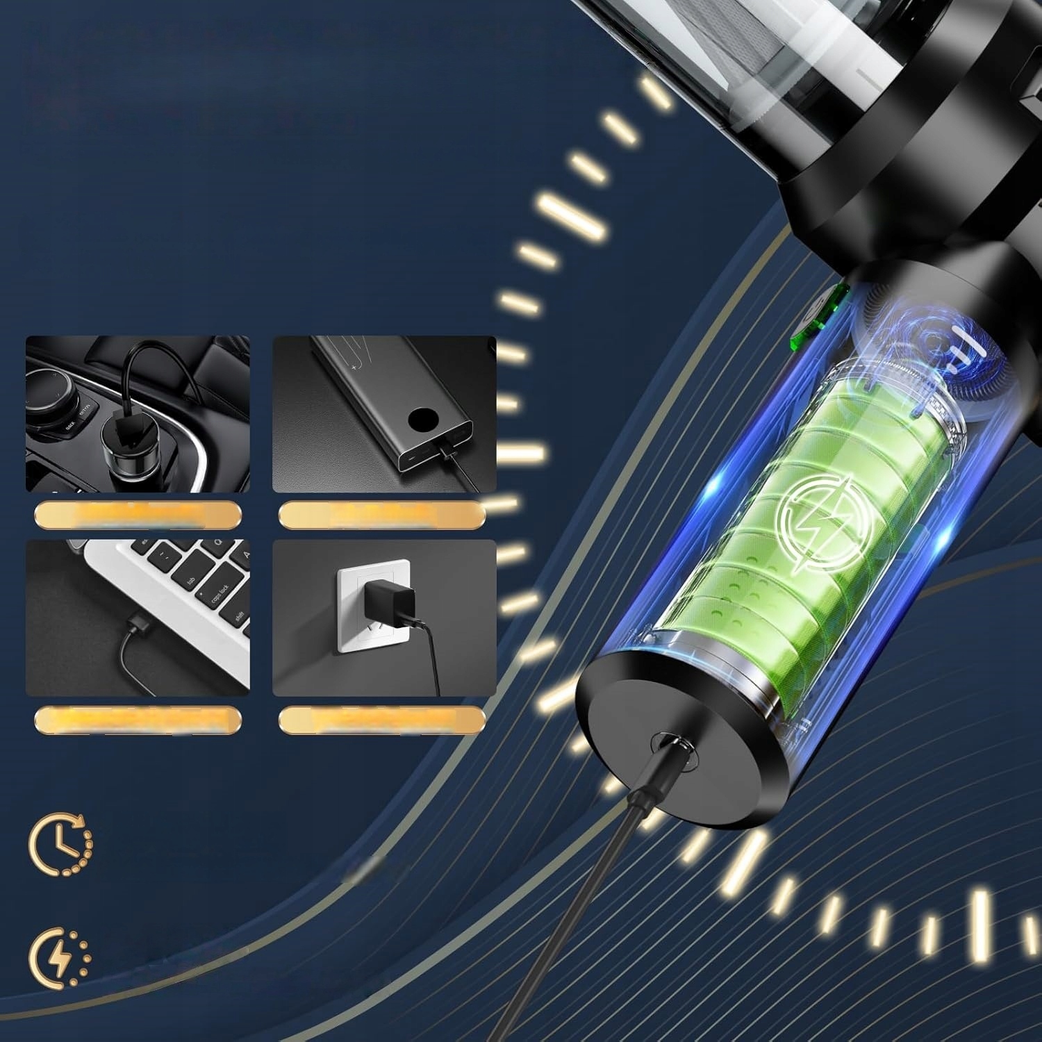 Потужна батарея на 6000 мАг і швидка зарядка: Оснащений довготривалою батареєю 6000 мАг, портативний пилосос забезпечує до 30 хвилин роботи на одному заряді. За допомогою зарядного кабелю USB-C, який входить у комплект, ви можете повністю зарядити свій пристрій протягом 3-4 годин. Завдяки універсальній опції заряджання через USB його можна зручно заряджати через комп’ютери, акумуляторні батареї або автомобільні зарядні пристрої – ідеально підходить для гнучкого використання вдома чи в дорозі.