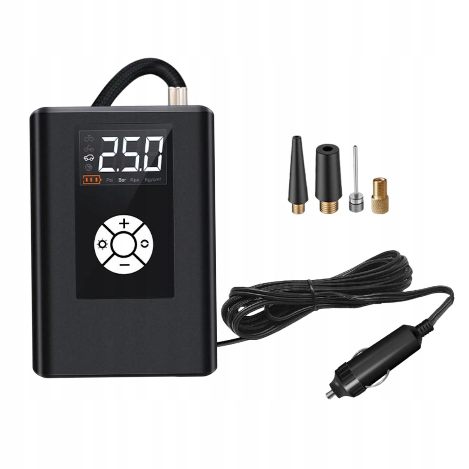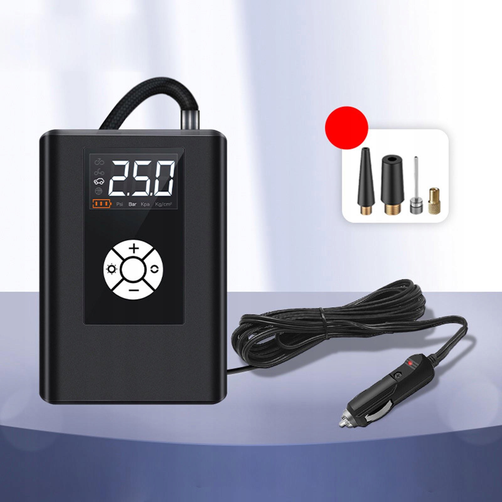 РК-дисплей: пристрій для накачування автомобільних шин має РК-екран, який показує одиниці PSI в режимі реального часу, щоб легко дізнатися тиск у шинах