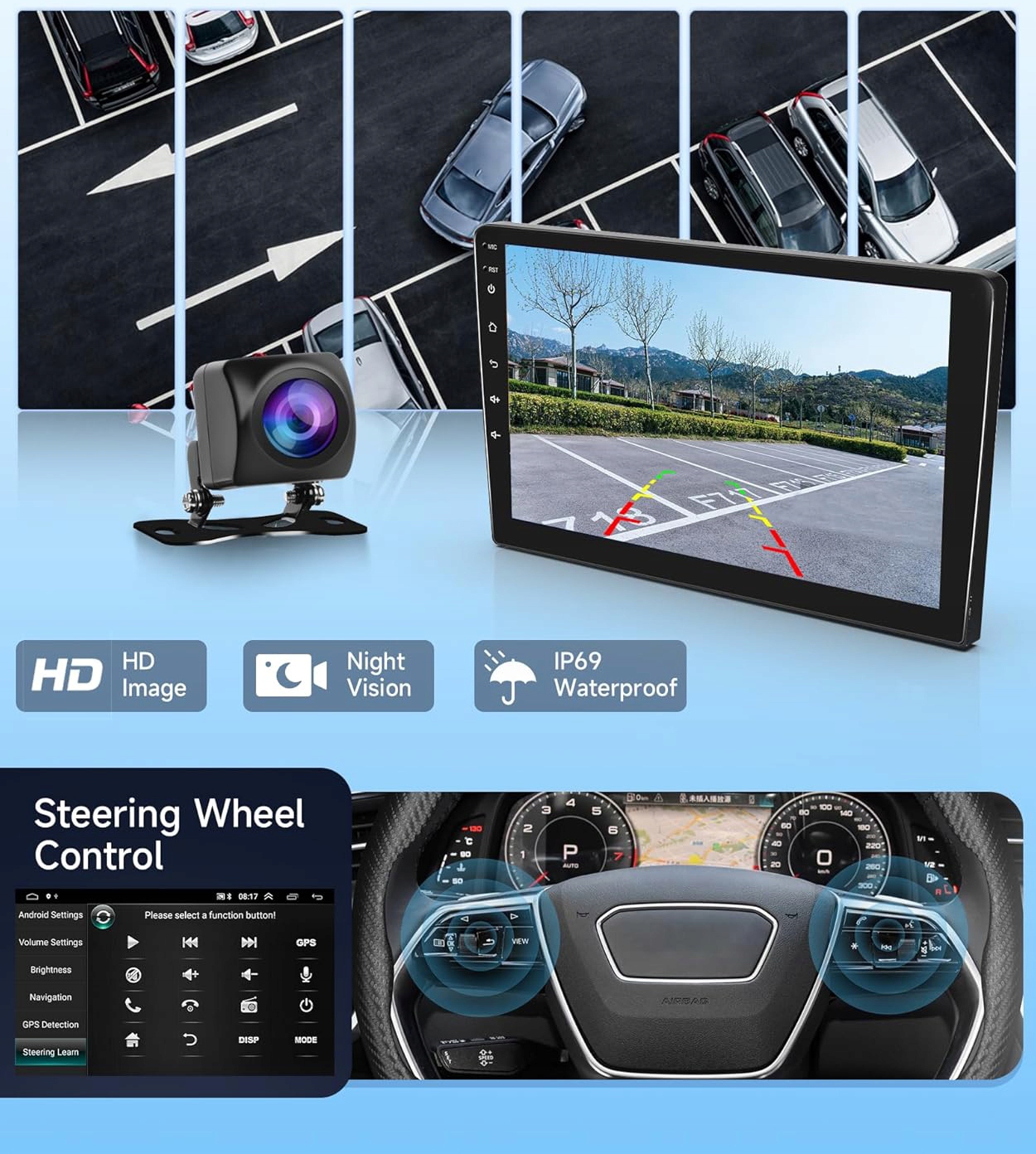 4 Радіо RDS відображає назву станції під час пошуку станції з чіткими каналами та може зберігати багато радіостанцій. Звуковий ефект Hifi чудово відновлює оригінальну текстуру музики.AHD -камера/керування керуванням: оснащений водонепроникною камерою AHD з нічним зором, екран автоматично переходить на задній вигляд під час реверсування, що дозволяє безпечно маневрувати в будь -який час. Підтримує управління з керма, тому ви можете змінити пісні та гучність безпосередньо з керма, що зручніше.