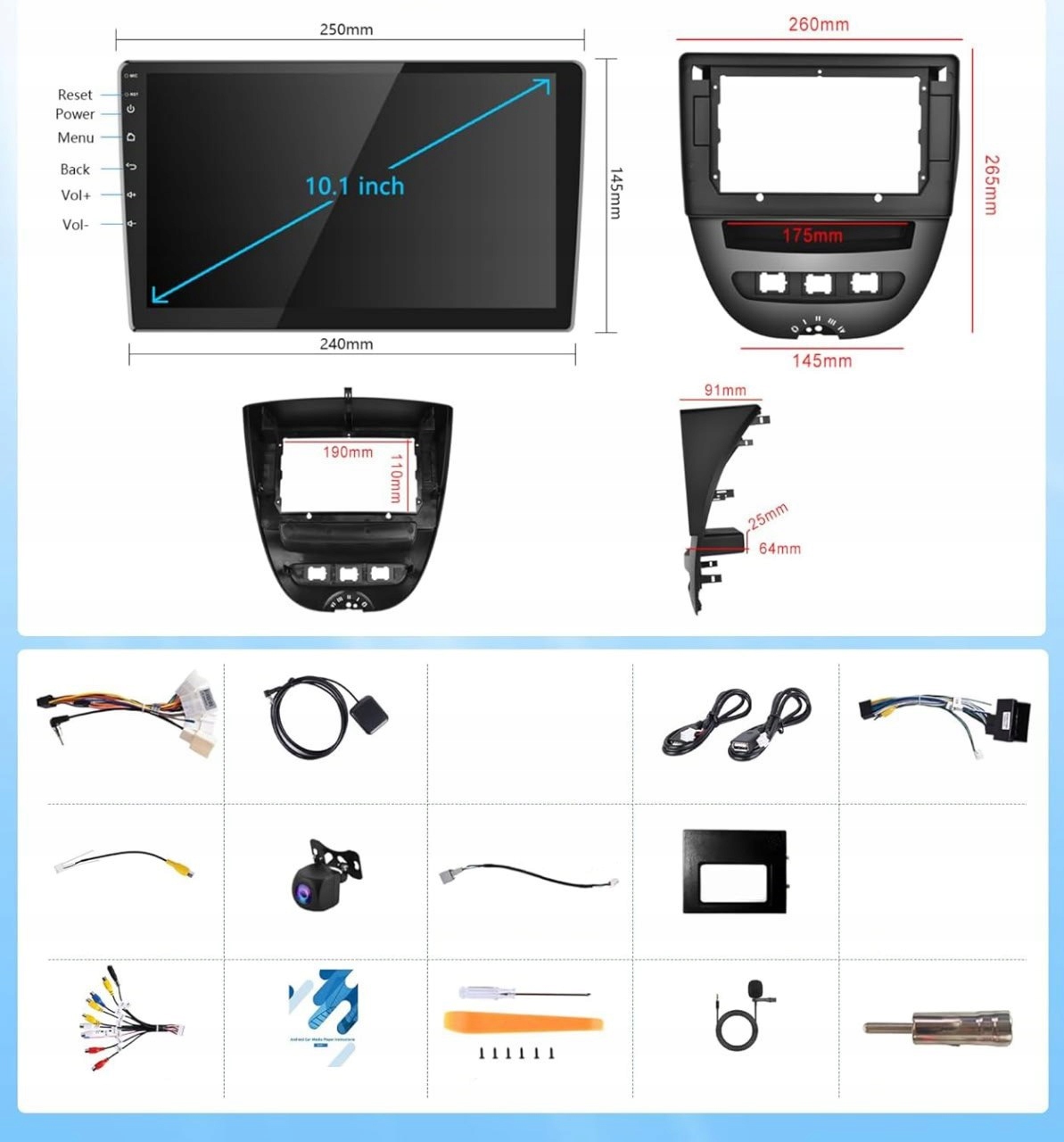 4 Оснащений 10-дюймовим екраном з високою чутливістю та роздільною здатністю 1024 x 600. Пристосований до Toyota Aygo/Peugeot 107/Citroen C1 з 2004-2014 років.Бездротовий Carplay/Android Auto: Ви можете бездротово підключитися до Carplay/Android Auto для доступу до з'єднань, повідомлень, музики, навігації тощо. Оснащений мікрофоном, який дозволяє керувати автомобілем більш розумним за допомогою помічника голосового помічника Siri/Google для контролю голосу. Ви також можете спроектувати екран телефону на радіо екрану за допомогою дзеркального посилання, щоб отримати ще кращий досвід.