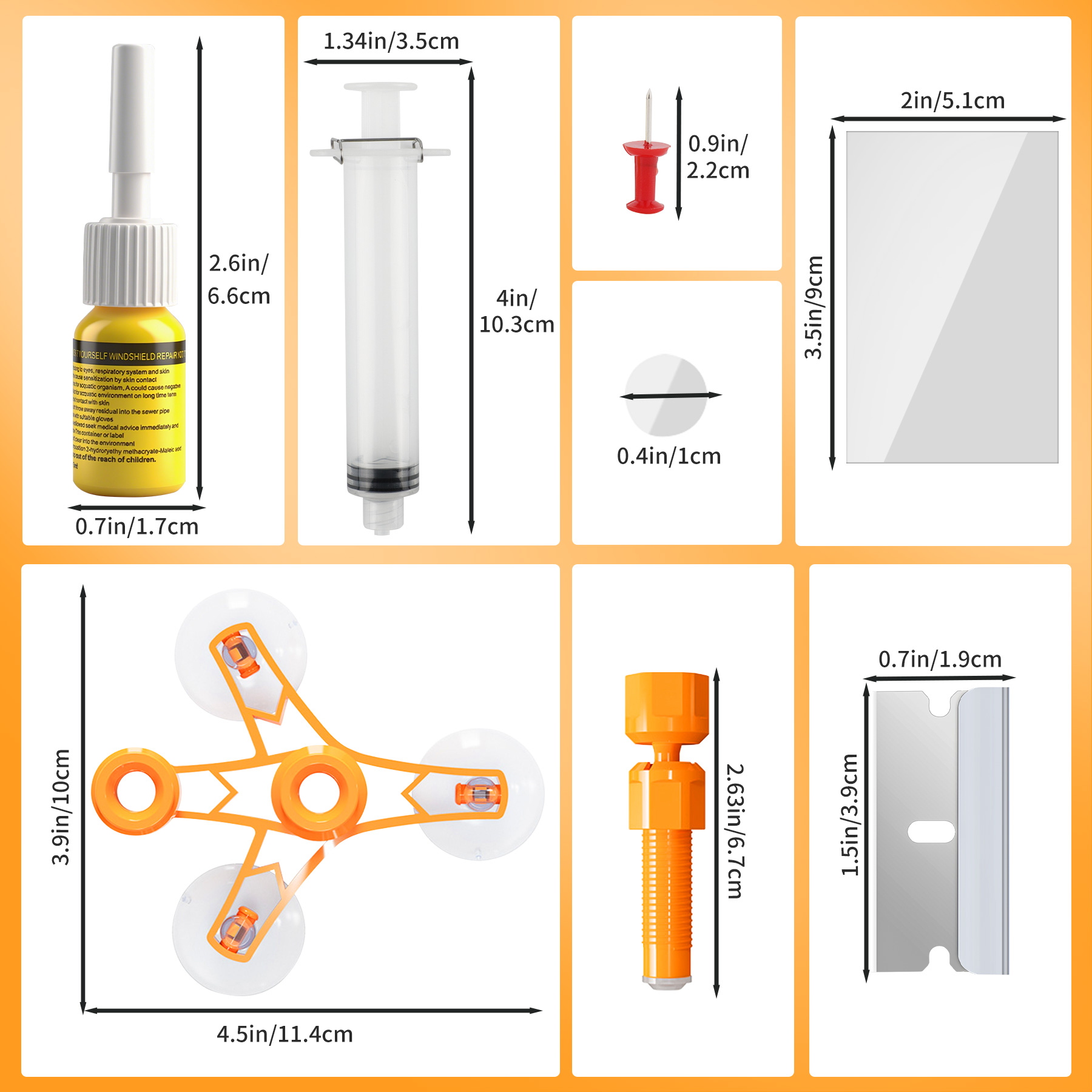 Цей набір для ремонту вітрового скла розроблено спеціально для більшості типів зовнішнього скла з подвійним пошкодженням лобового скла. Набори для ремонту лобового скла найкраще підходять для невеликих тріщин, відколів, пошкоджень у формі зірки, тріщин діаметром до фута та круглих пошкоджень діаметром до одного дюйма. (Примітка: підходить лише для ремонту скла автомобіля)