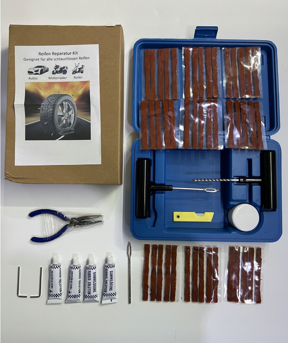 Аварійний ремкомплект для швидкого ремонту безкамерних шин до 6 мм на автомобілях, квадроциклах, причепах тощо.