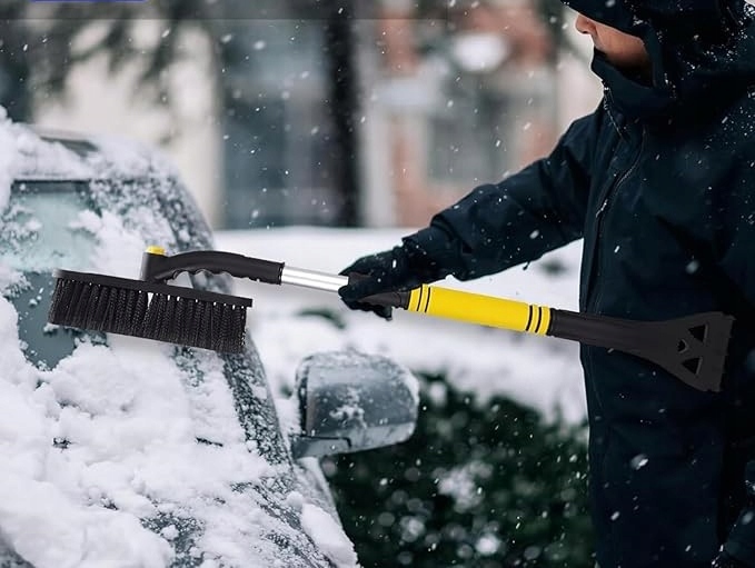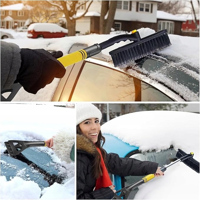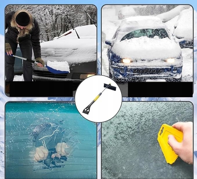 - 【Щітка для снігу 2 в 1】Наша щітка для снігу складається з скребка для льоду, обертової головки щітки для снігу та телескопічної стрижень. Автомобільний скребок зі сніговою щіткою виконує дві функції: прибирання снігу та прибирання льоду. Ви можете легко зламати товстий лід за допомогою скребка, а потім змести сніг головкою щітки.