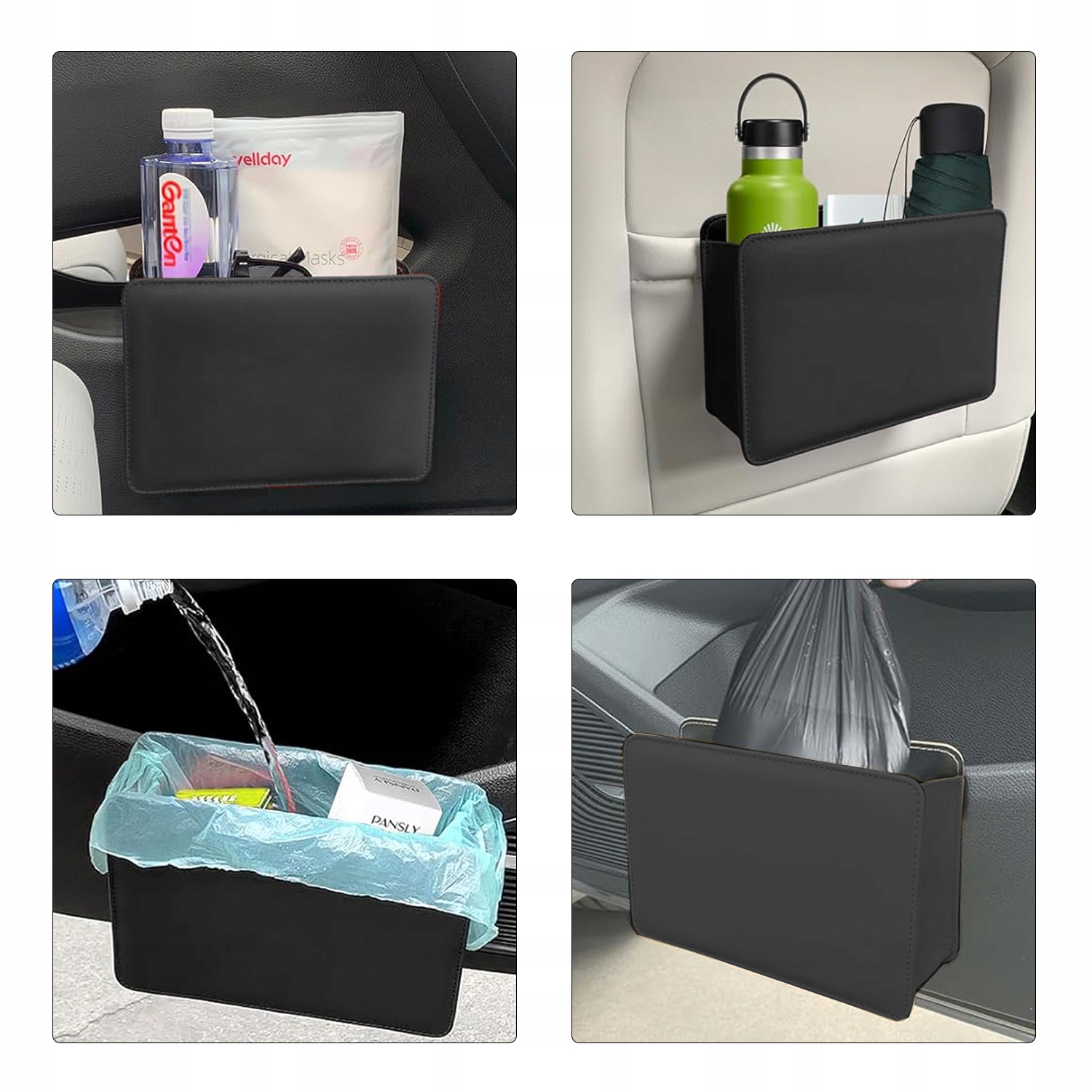 Контейнер для автомобіля має 2 сильні гачки, які можна легко вставити в краї двері автомобіля, заднє сидіння або середню консоль. Смітник для сміття є практичним для зберігання паперу, мисків з фруктами та іншим сміттям. Контейнер для автомобіля також може використовуватися як коробка для зберігання парасольок, пляшок, чашок з водою, хустками, іграшками, закусками, іншими невеликими необхідними речами тощо. Це зручно і практично.