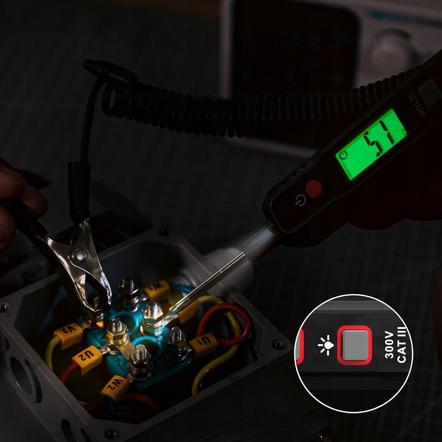 - Зонд має захисний ковпачок від короткого замикання. - Оснащений РК-дисплеєм із підсвічуванням і ліхтариком, що забезпечує більш чітке читання та точну роботу в темних місцях. Коротке натискання кнопки освітлення вмикає/вимикає підсвічування екрана, а довге натискання вмикає/вимикає ліхтарик.