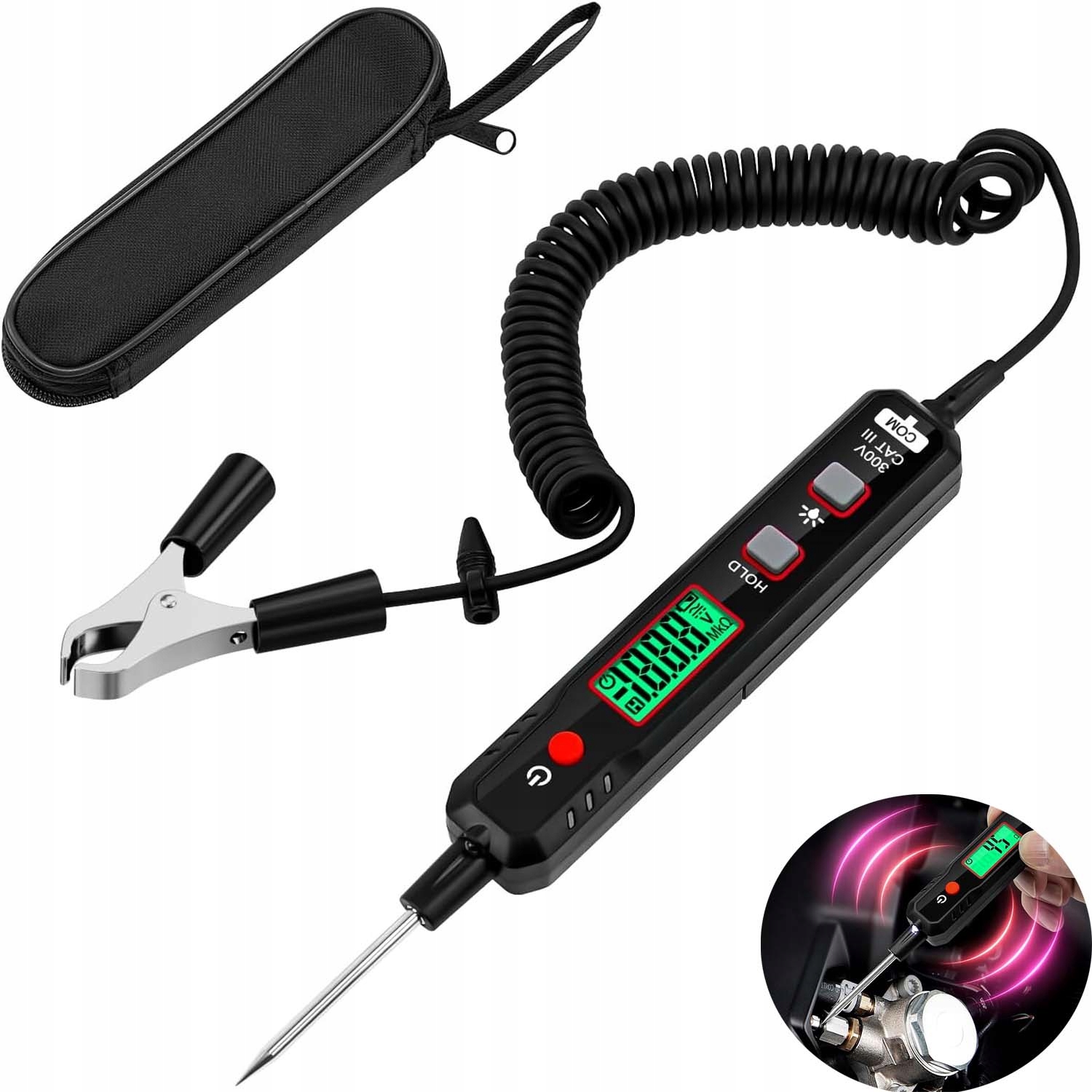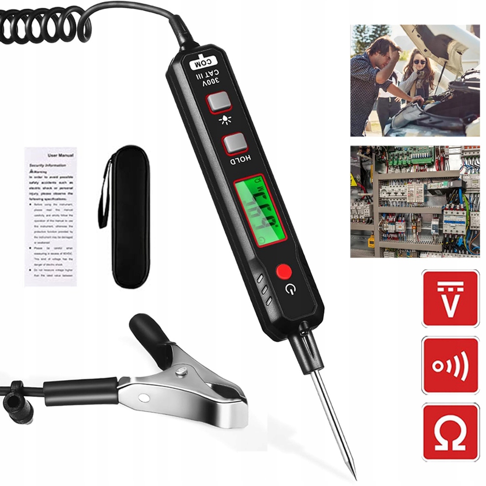 - широкий діапазон виявлення від 0,8 В до 100 В постійного струму робить пристрій придатним для різноманітних випробувань ланцюгів автомобіля, таких як перевірка запобіжників автомобіля, кабель перевірка, перевірка акумулятора та системи ACC, що полегшує перевірку на наявність проблем у вашому автомобілі. Пристрій може автоматично визначити позитивний і негативний полюси батареї, а знак «-» перед зчитуванням вказує на негативний полюс. Кнопка утримання даних дозволяє зберегти дані на екрані без змін, щоб зберегти ваші дані.