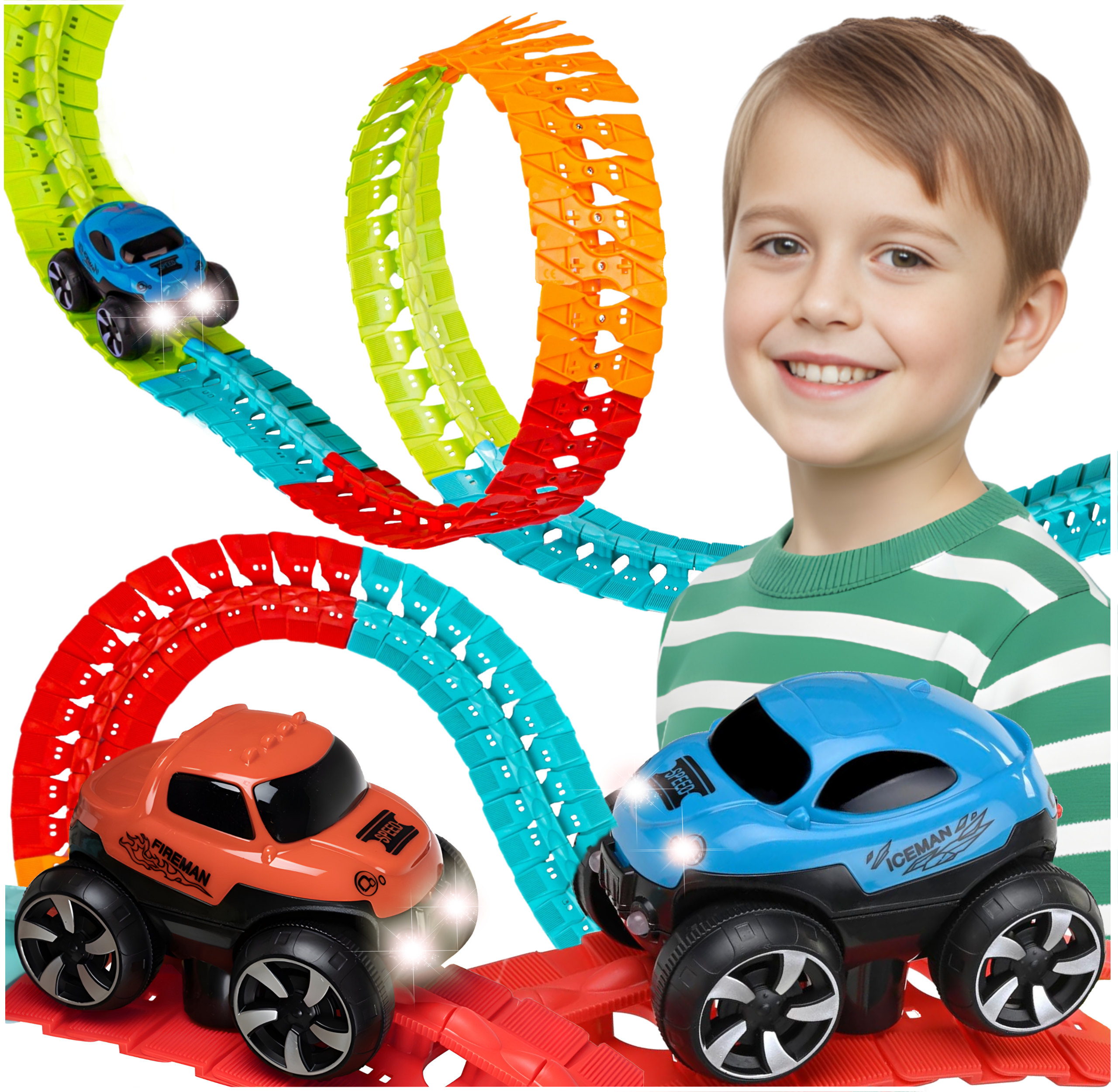 ПРИВАБЛИВИЙ ЗОВНІШНИЙ ВИД - елементи траси виконані в чотирьох різних кольорах, що збагачує візуальний аспект гри. Крім того, машина з набору має світлодіодне освітлення, яке підкреслює ефект їзди по трасі, особливо в затемненому середовищі.