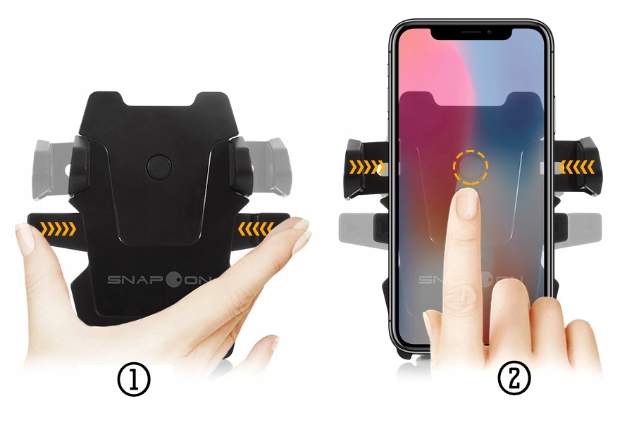 ☑️ На панелі тримача є кнопка, натискання якої звільняє руки, що тримають телефон [2]. Щоб знову відкрити тримач, просто (також однією рукою) стисніть смужку, що відкривається [1]