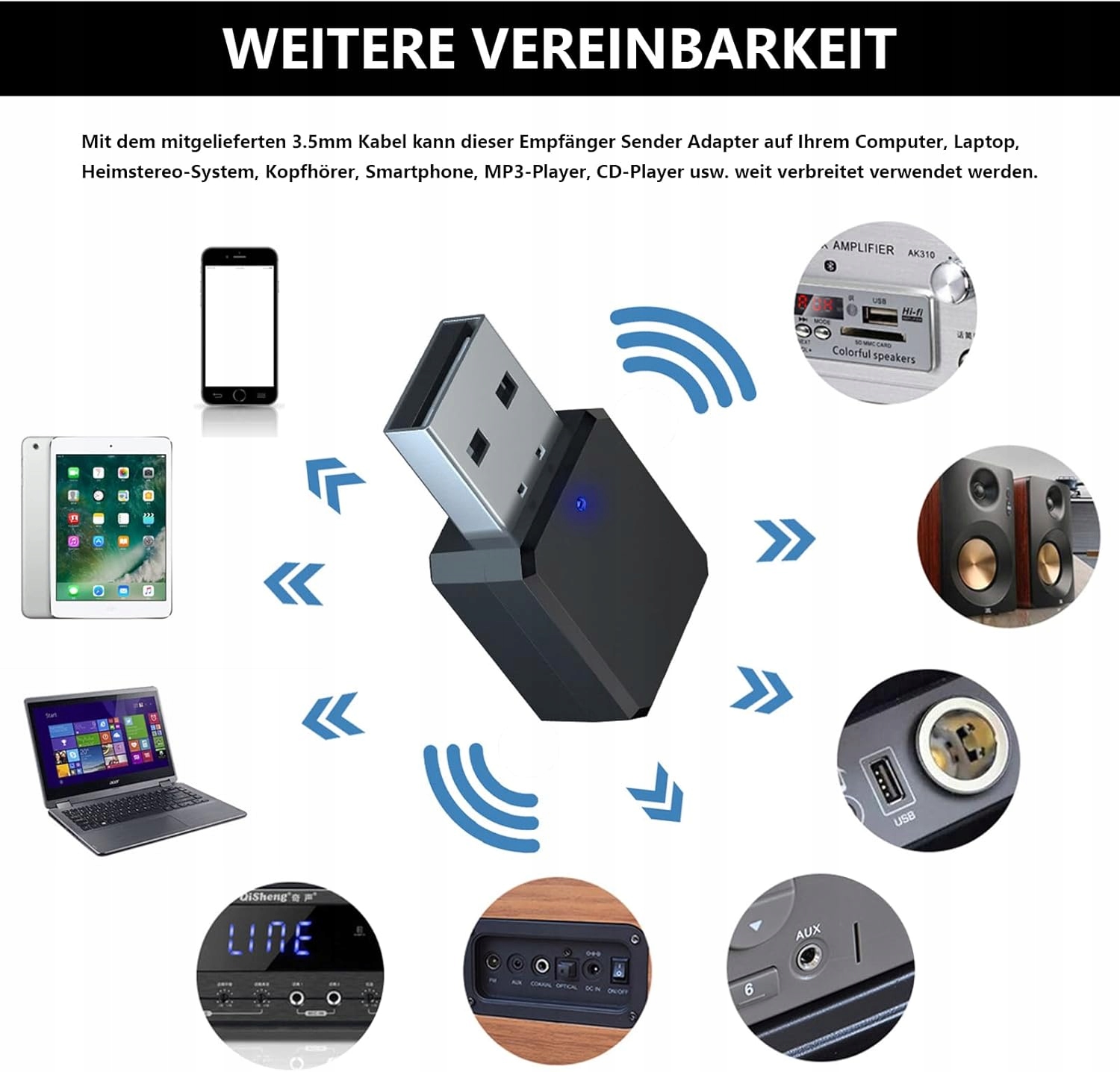 - Bluetooth 5.1: наш USB-адаптер Bluetooth оснащено чіпом Bluetooth 5.1 і має подвійний вихідний інтерфейс USB. Пристрої без функції USB також можуть передавати дані в режимі AUX, швидше й без затримок