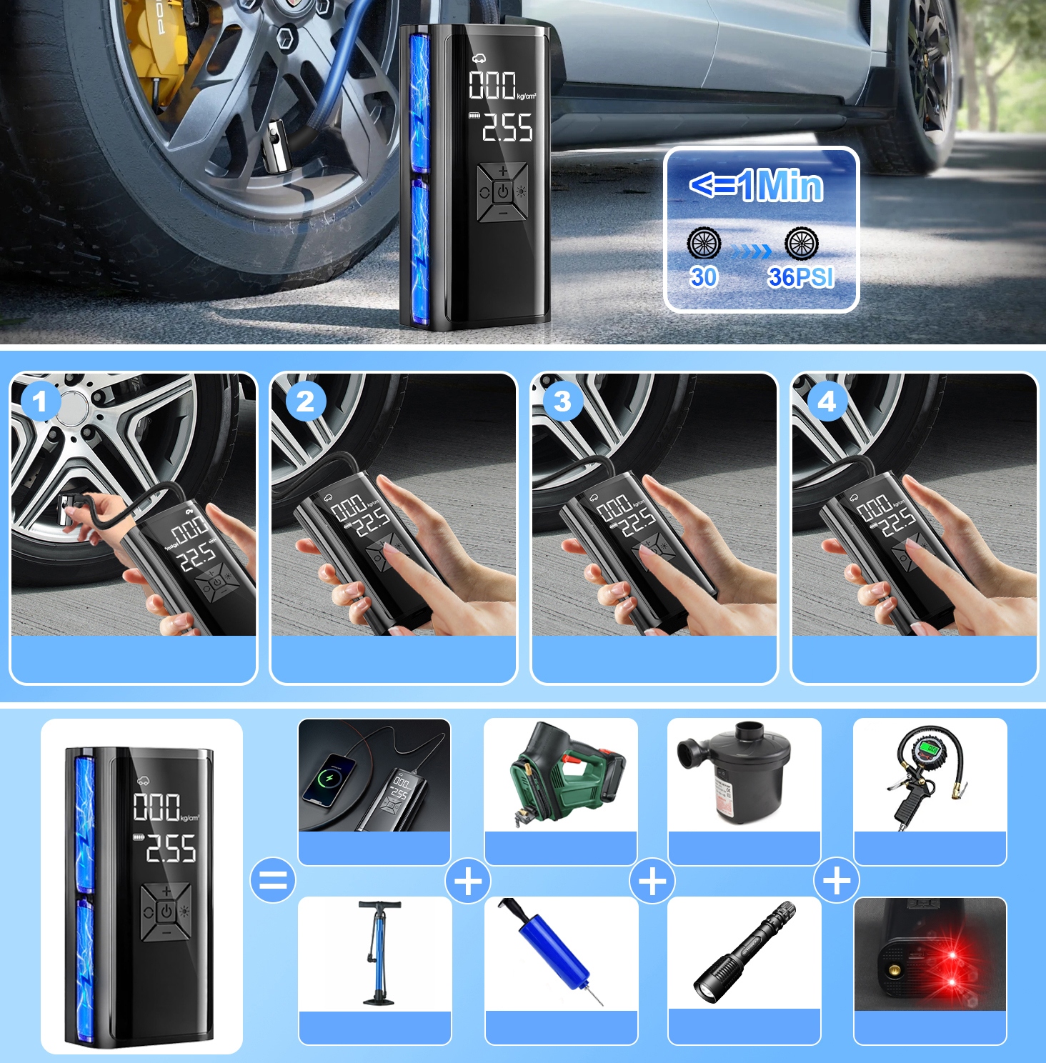 ▶️ МОБІЛЬНИЙ USB-КОМПРЕСОР до 150 PSI - бездротовий автомобільний компресор з ліхтариком і Powerbank