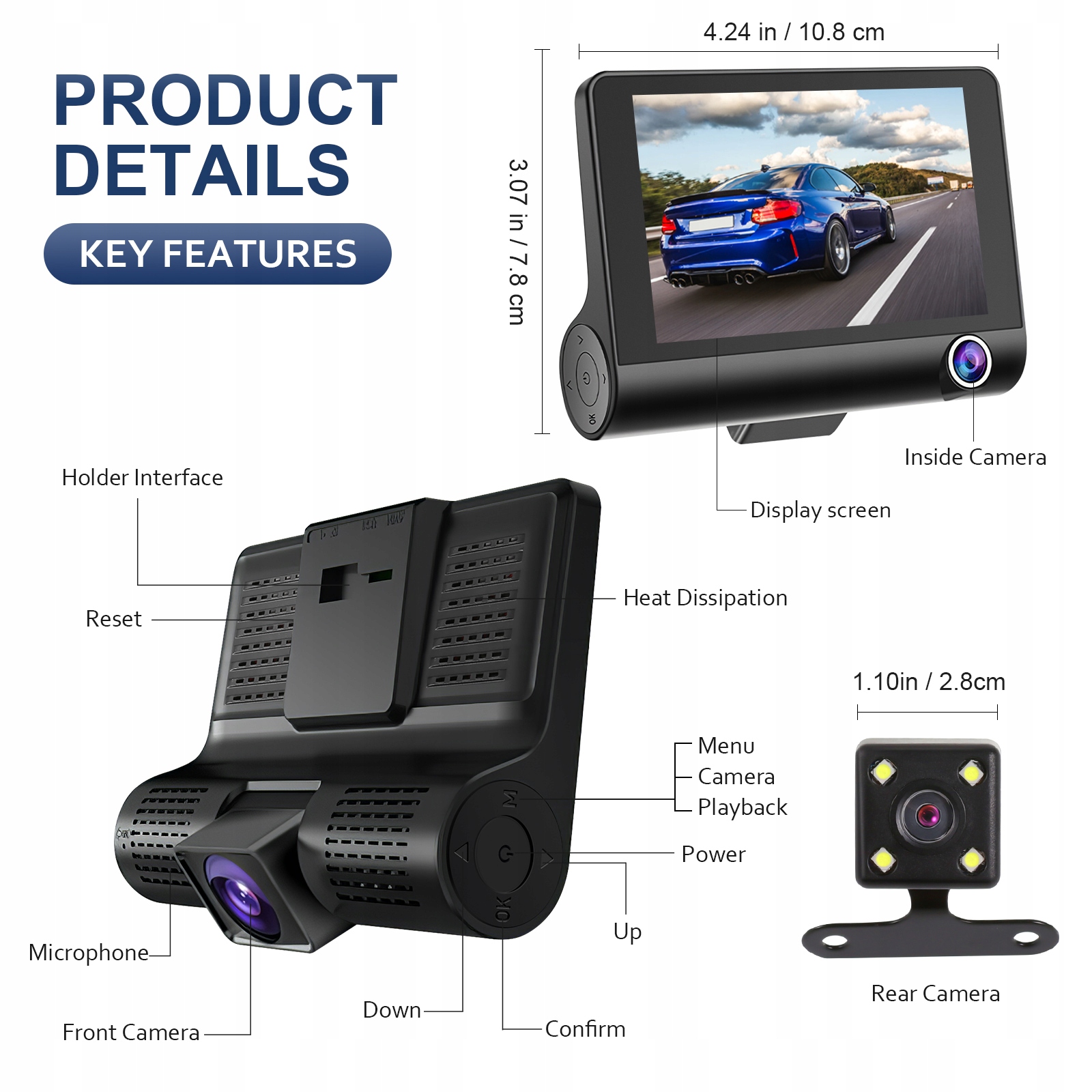 - Ви все ще шукаєте практичну автомобільну камеру? Будь ласка, зверніть увагу на цей продукт. Це прихована автомобільна камера. Він має багато переваг і функцій, таких як великий екран, широкий кут, нічне бачення, три камери, виявлення руху, циклічний запис, датчик сили тяжіння тощо. Це чудова допомога для вашого автомобіля.