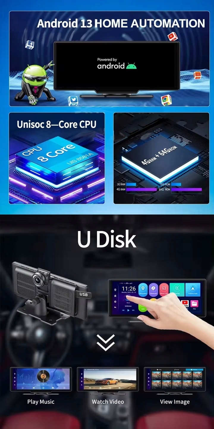 Система Android 13 і восьмиядерний процесор Unisoc UIS8581A та внутрішня пам’ять RAM/ROM: 4 ГБ/64 ГБ. (базові програми займають близько 3 Гб). Підтримка карток пам’яті SD до 256 ГБ.