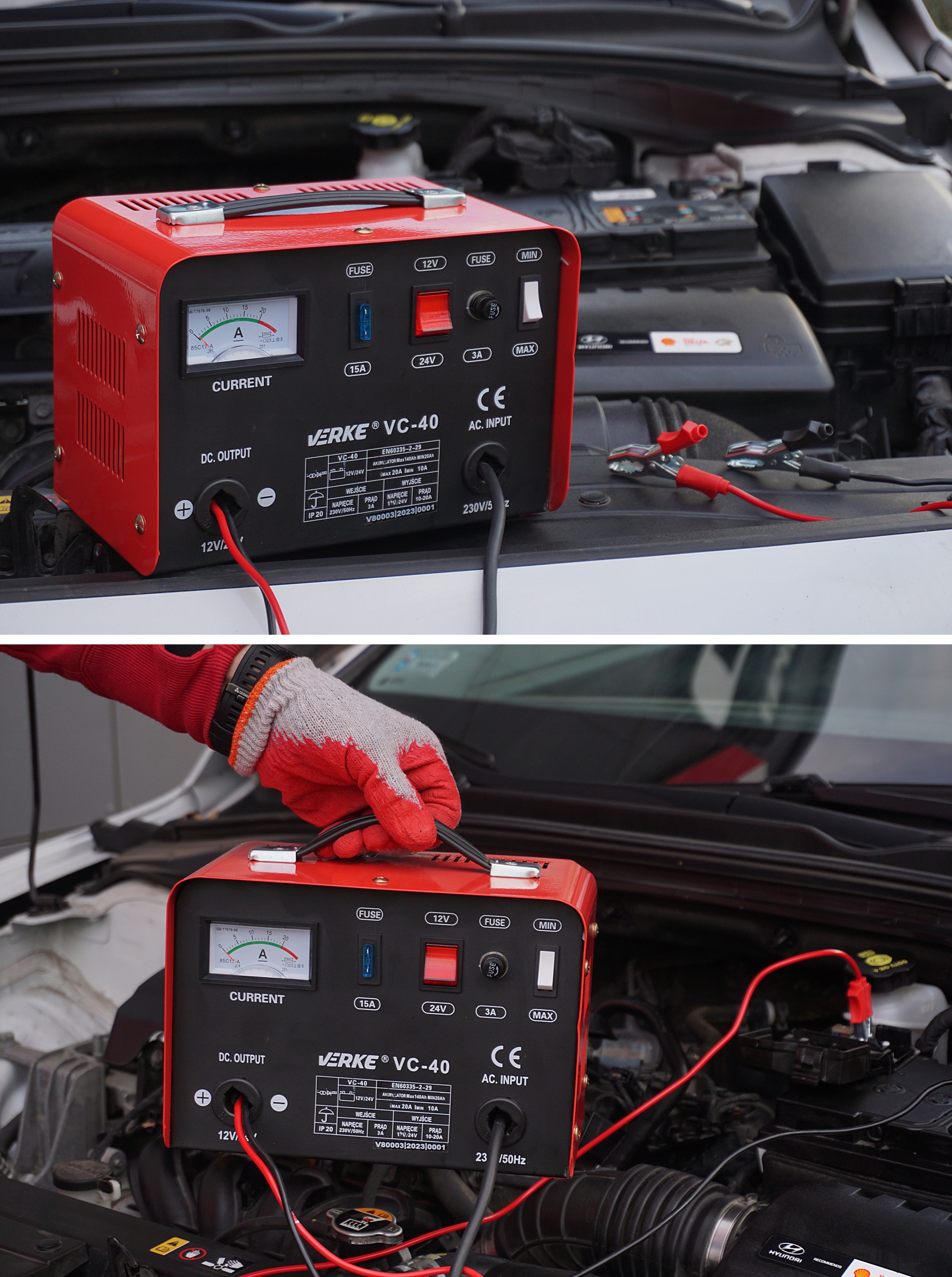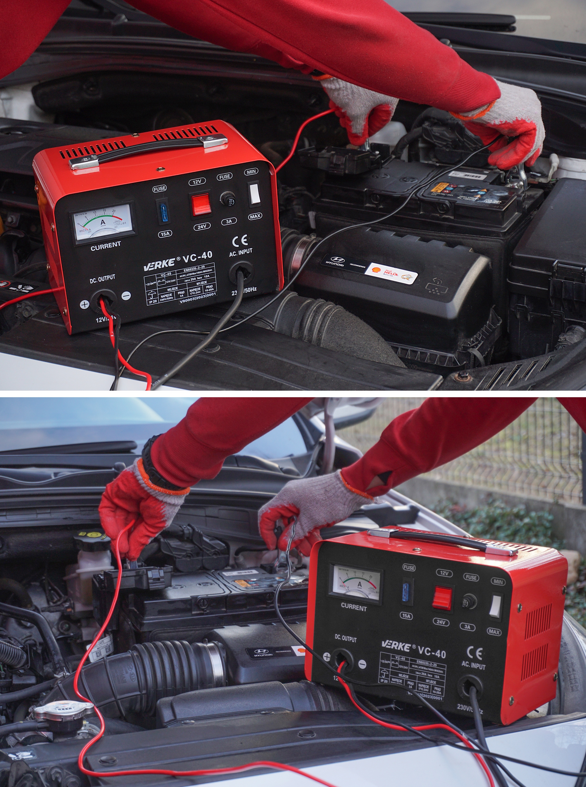 Модель VC-40 -це професійний пристрій для зарядки акумуляторів у автомобілях, мотоциклах або моторних човнах. Це універсальний сучасний випрямляч 12/24 В, який дозволяє заряджати різні типи акумуляторів: традиційні, кислотні наноїдні самообслуговування та без технічного обслуговування. Це надзвичайно просто у використанні, завдяки якому кожен легко заряджатимуть пристрій, що постачає транспортний засіб. Пристрій має перемикач, завдяки якому ви можете вручну перейти на 12 В або 24 В залежно від ваших потреб, перш ніж заряджати акумулятор. Він легко заряджає популярні батареї автомобілів та мотоциклів та багато інших. Він надзвичайно легкий і маленький, тому ви можете легко переміщувати і зберігати його в машині або вдома.