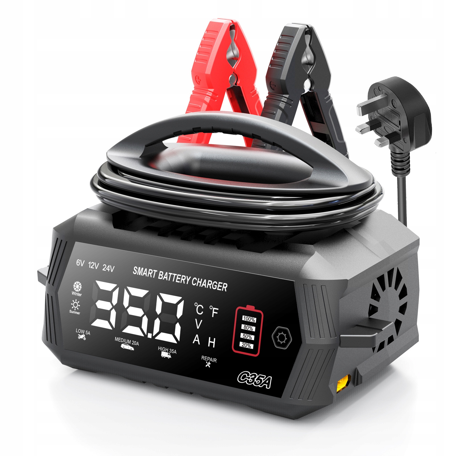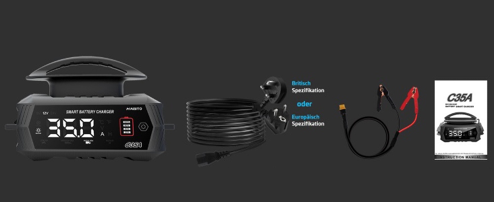 【Що ви отримуєте】1 x 6V/12V/24V 35A зарядний пристрій для автомобільного акумулятора (2 м кабелю змінного струму, 1 м затискача), 1 x посібник користувача та 12 місяців гарантії.