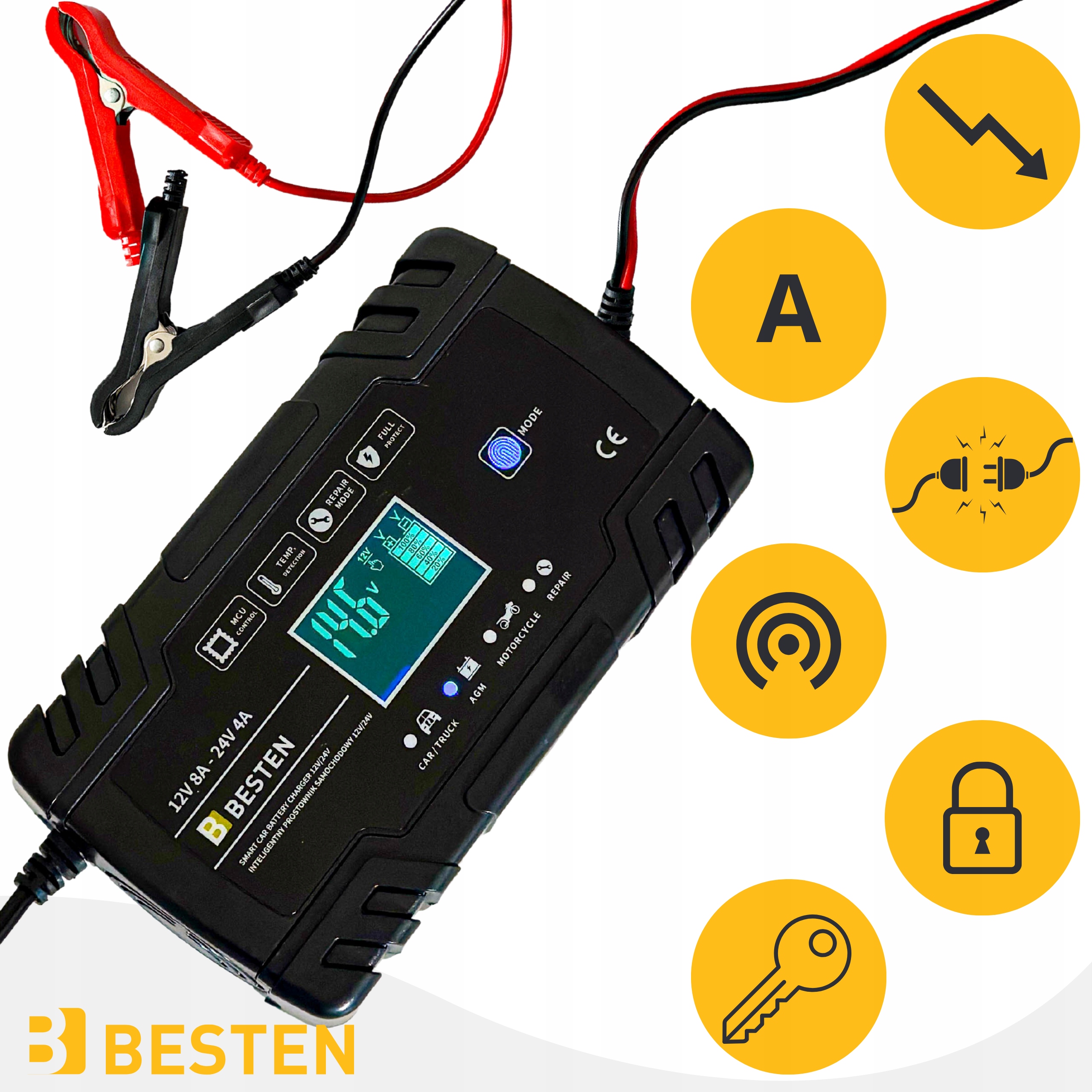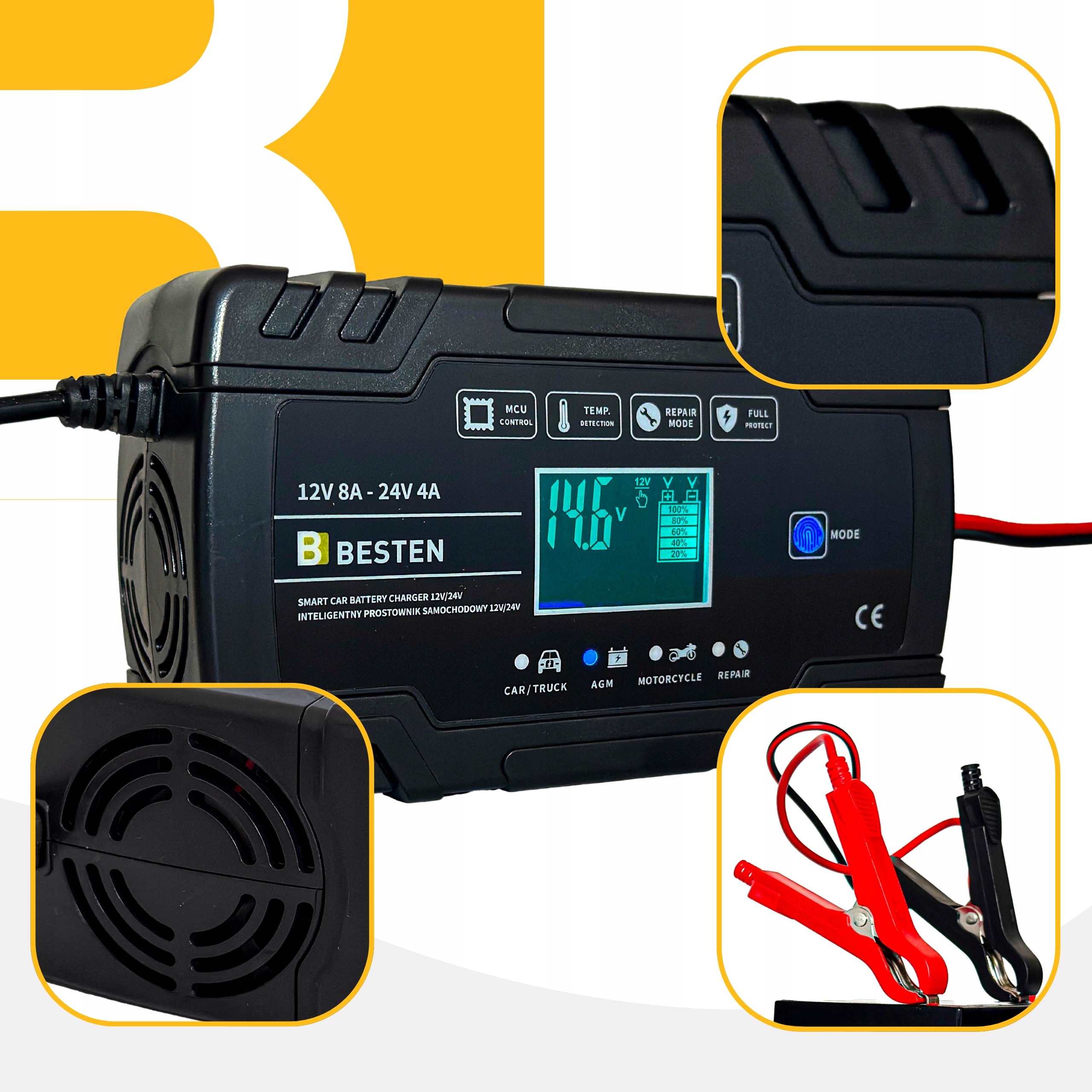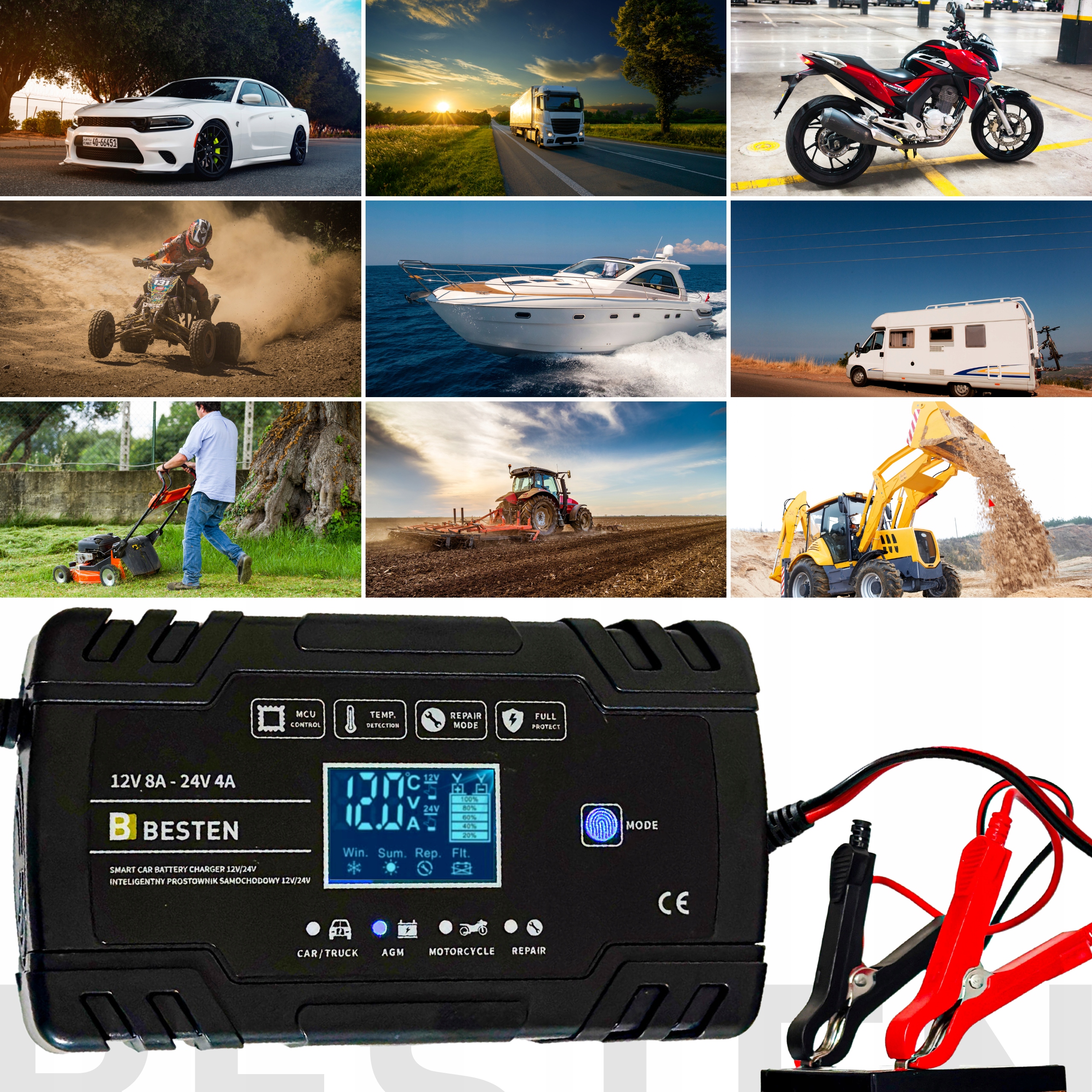 УНІВЕРСАЛЬНІСТЬ - Випрямляч призначений для батарей 12В і 24В. Він підходить для заряджання акумуляторів мотоциклів, легкових автомобілів і вантажівок, таких як AGM, VRLA, WET, GEL, EFB, AGM.