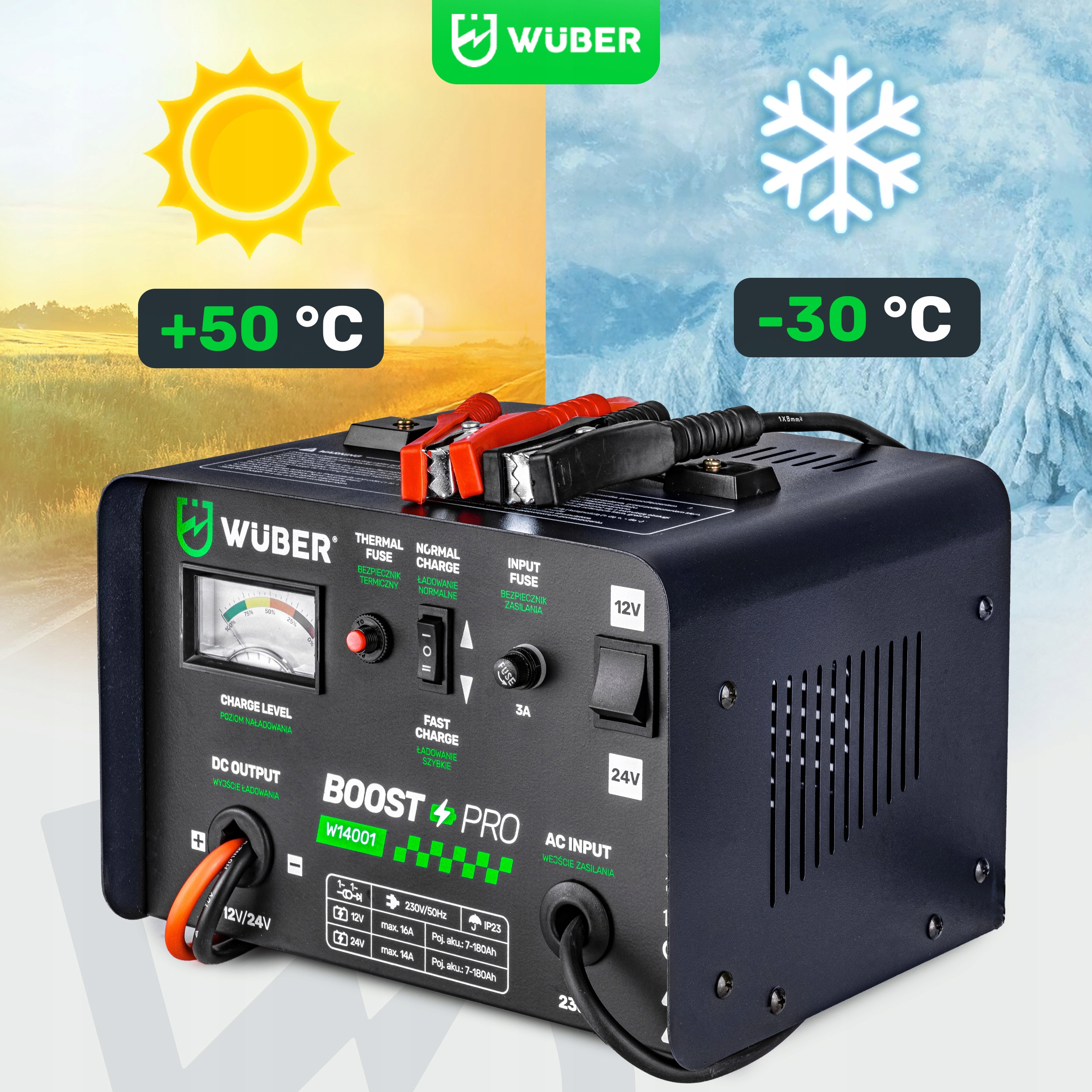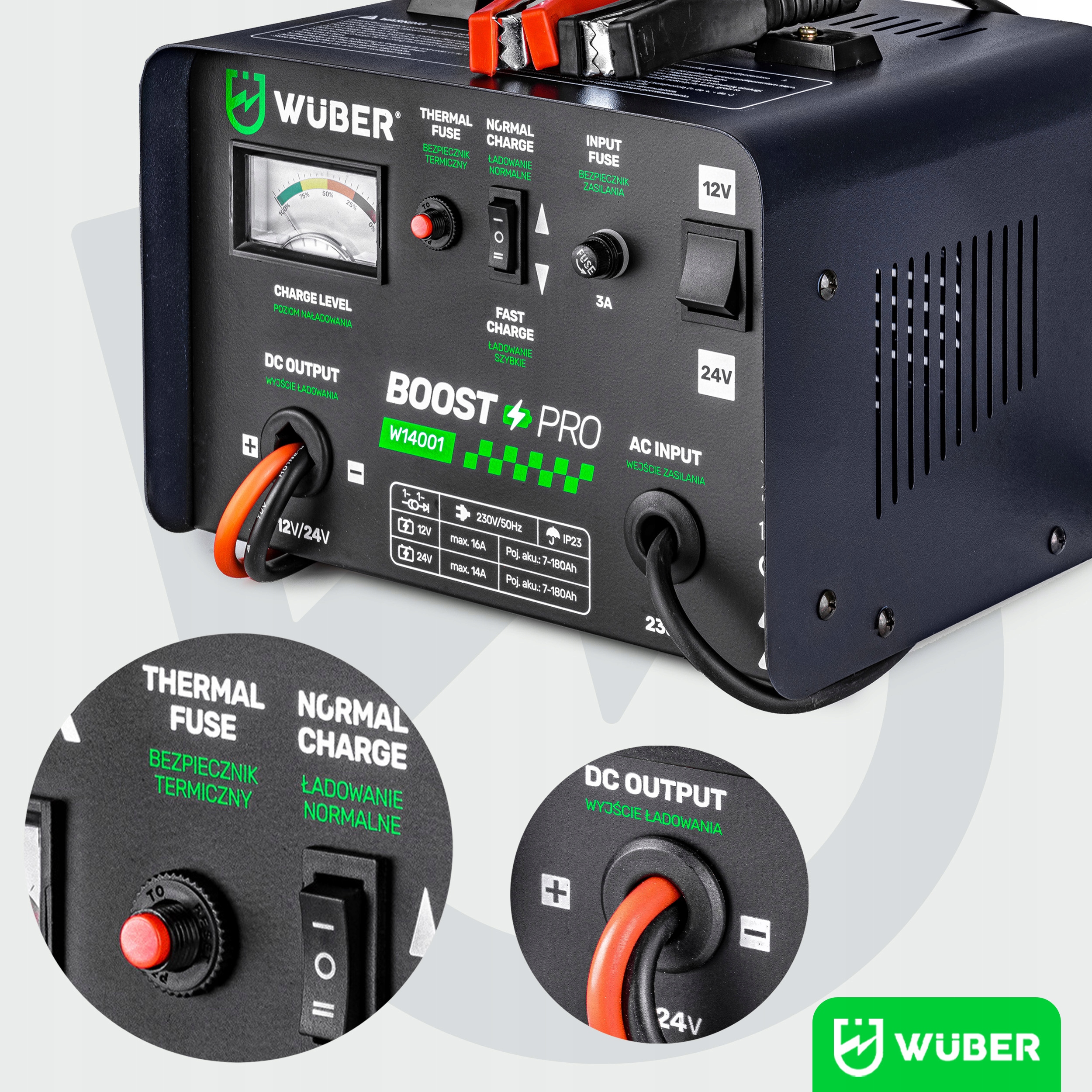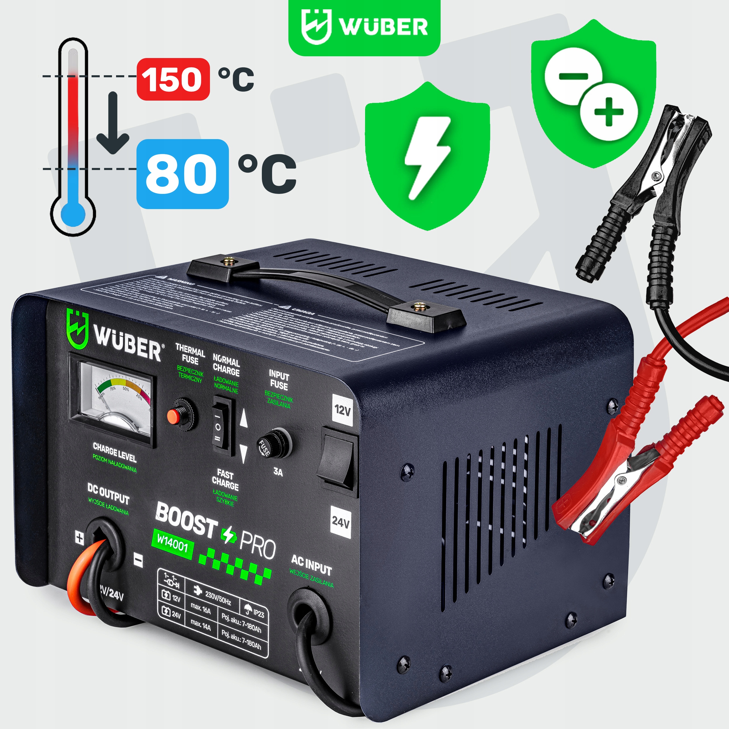 ► Макс. Зарядний струм 16A ► Запобіжник 15A ► Тороїдальний трансформатор ► Акумулятори 7-180Ah ► 12V та 24V ► Функція швидкого заряджання ► Система охолодження ► Від дверей до дверей ► Товсті та довгі кабелі 1,4M