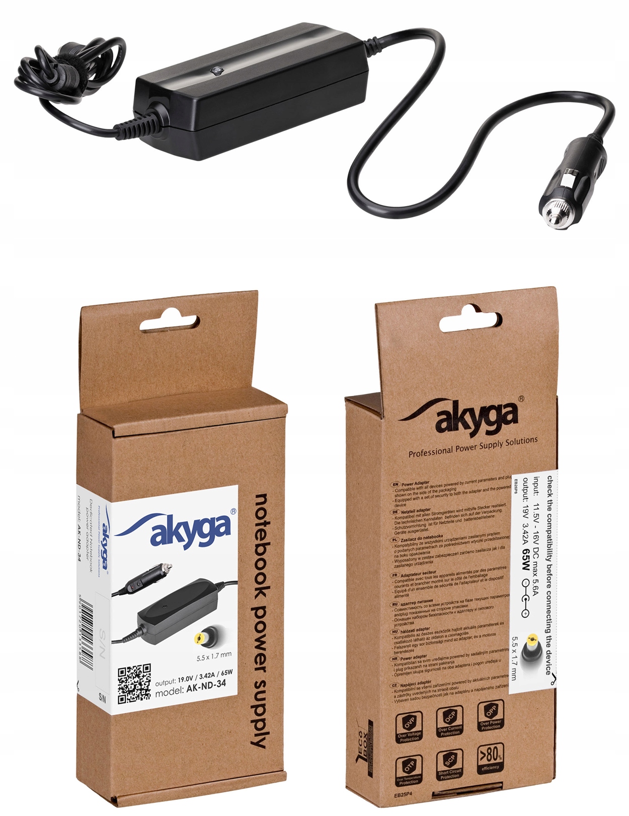 AK-ND-34 b> – це автомобільний блок живлення потужністю 65 Вт, сумісний з усіма моделями ноутбуків, що живляться від 19 В і максимум 3,42 A, і з вилкою 5.5*1.7