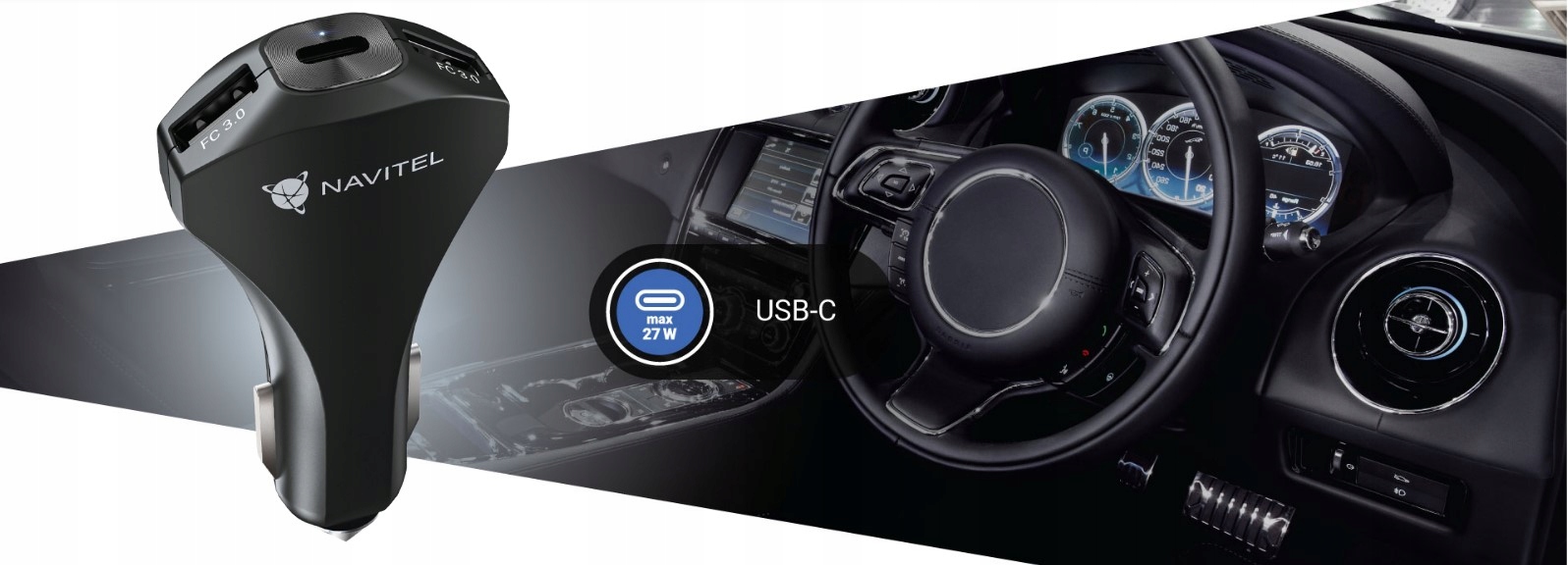NAVITEL USP45 SLIM - універсальний автомобільний зарядний пристрій з двома USB-A швидкої зарядки роз'єми і роз'єм USB-C.