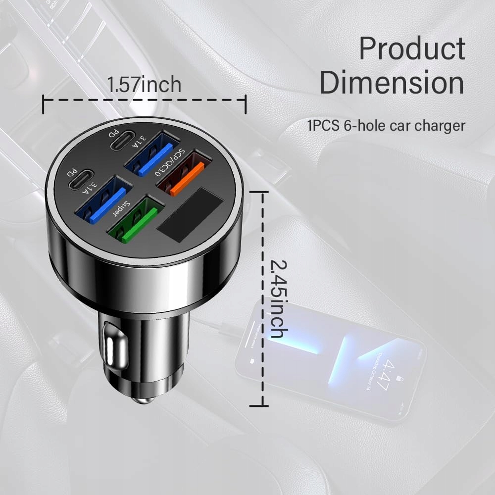- Вбудовані 6 портів для заряджання: автомобільний зарядний адаптер із 6 портами USB: 1*SCP або QC3.0, 2*3,1A, 2*PD 20W і 1*SUPER порт для швидкого заряджання, підтримує одночасне заряджання 6 пристроїв, забезпечує спільне живлення між телефонами та планшетами