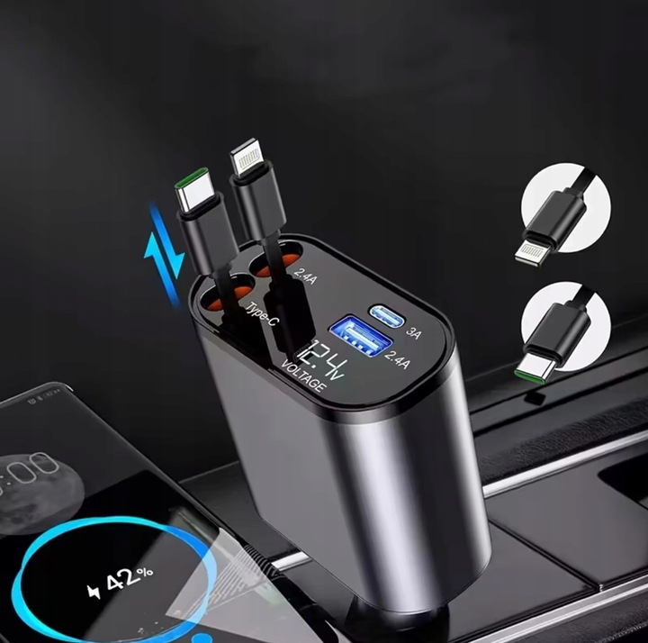 АВТОМОБІЛЬНИЙ ЗАРЯДНИЙ ПРИСТРІЙ USB-C/IOS 100 Вт З СОЄДНЕННЯМ І РОЛИКОМ 80 СМ