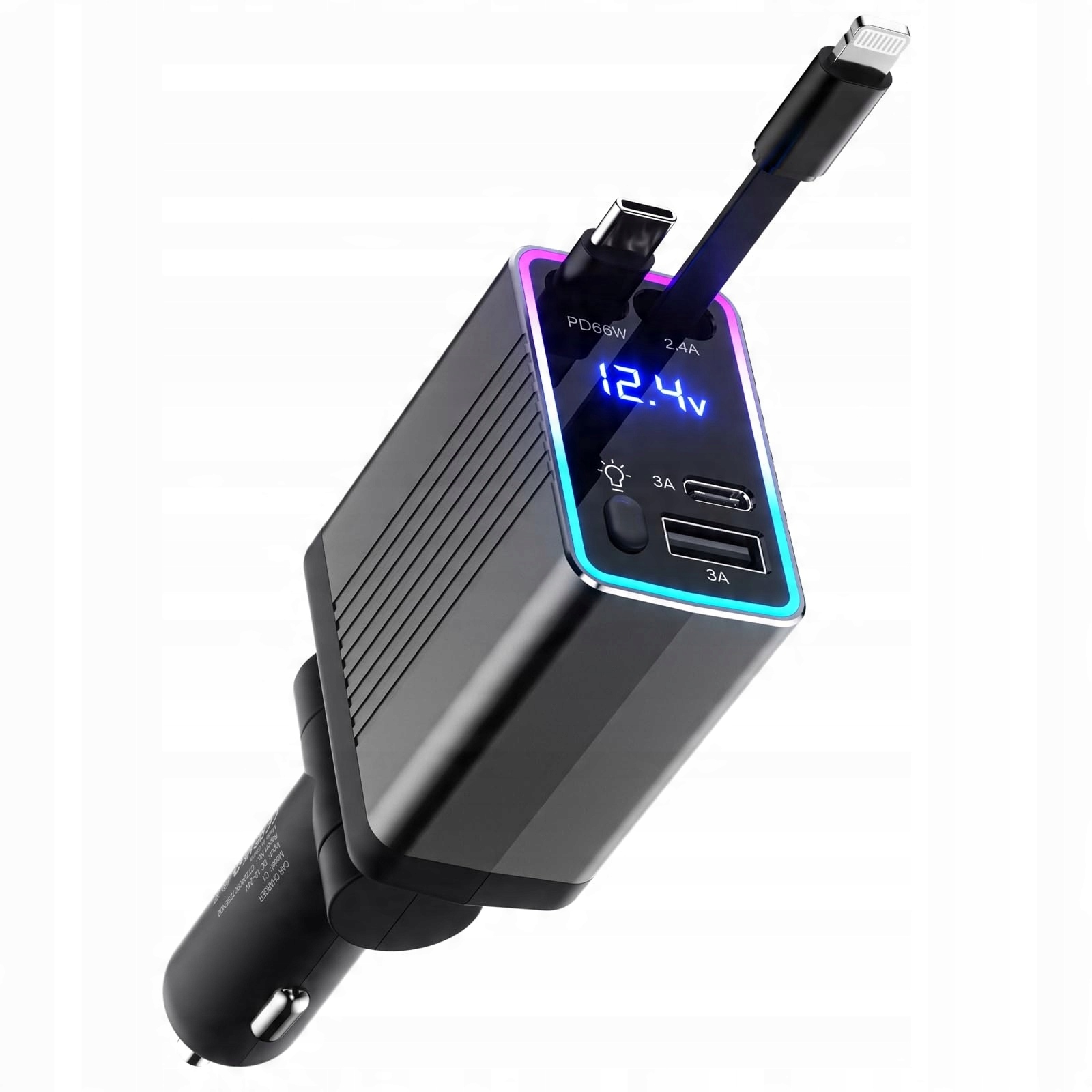 Цей автомобільний зарядний пристрій, оснащений кабелем Type-C і Lightning, а також додатковими портами Type-C і USB-A, може безпечно заряджати до чотирьох пристроїв одночасно. Максимальна вихідна потужність 120 Вт. Завдяки швидкому заряджанню PD 66W може заряджати пристрої від 0 до 65% всього за 15 хвилин. (Примітка. Автомобіль потрібно завести, перш ніж буде достатньо напруги для підтримки швидкої зарядки Type-C PD)