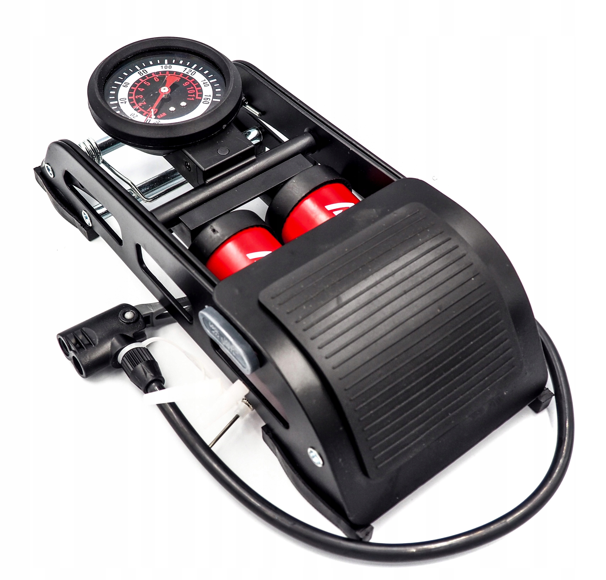 - Легке та швидке накачування – за допомогою наддовгого шланга, ефективних подвійних циліндрів і нековзної підставки для ніг ваші шини будуть накачані миттєво.