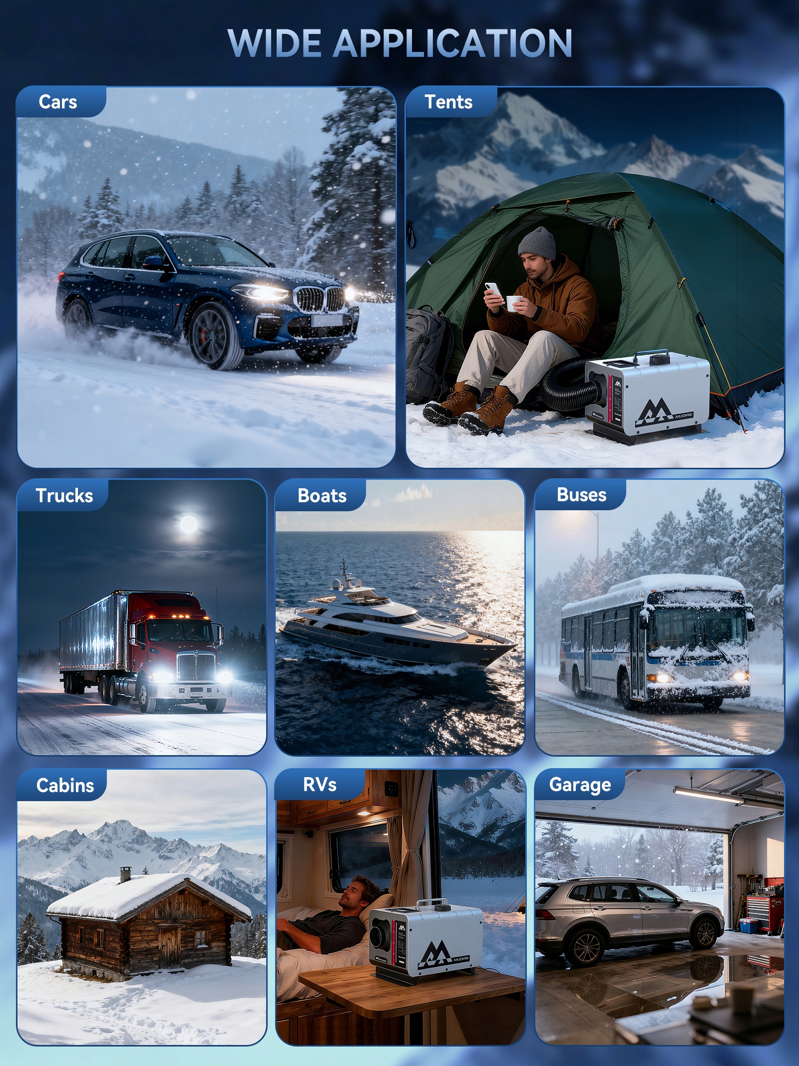 Дизельний обігрівач MUDIRO підтримує 12 В, 24 В і містить трансформатор 240 В. Підключайте безпосередньо до домашньої розетки - не потрібні додаткові деталі чи ремонт. Насолоджуйтесь надійним теплом у будь-якому місці: у гаражі, на автофургоні, автомобілі, вантажівці, кемпері, наметі, кабіні чи робочому місці. Залишайтеся в теплі всю зиму.