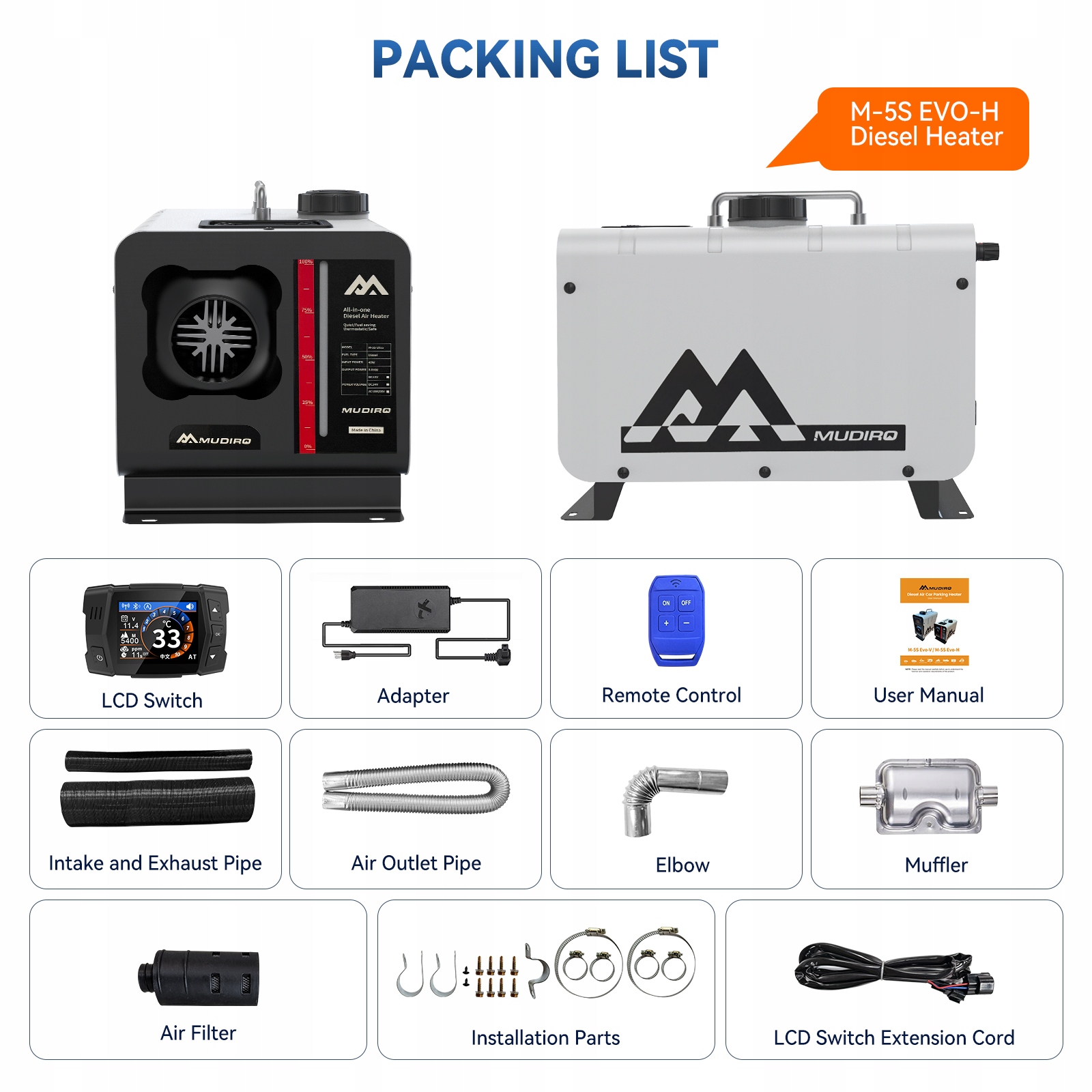 У комплект входить дизельний обігрівач Mudiro M-5S EVO-H: