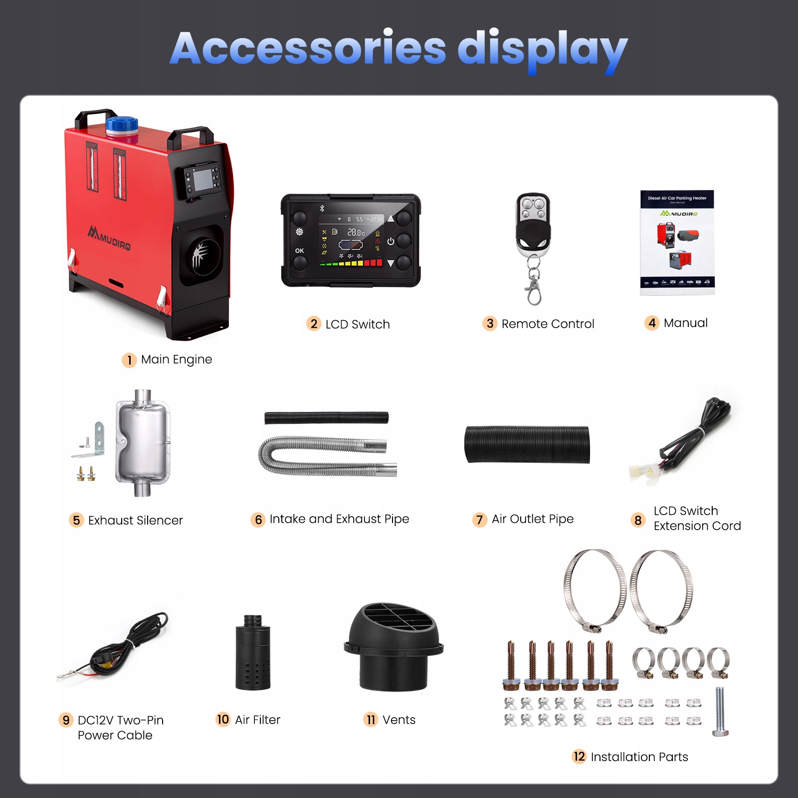 Дизельний обігрівач MUDIRO підтримує 12 В, 24 В. Насолоджуйтеся надійним теплом у будь-якому місці: у гаражі, на автофургоні, автомобілі, вантажівці, кемпері, наметі, кабіні чи робочому місці. Залишайтеся в теплі протягом усієї зими.