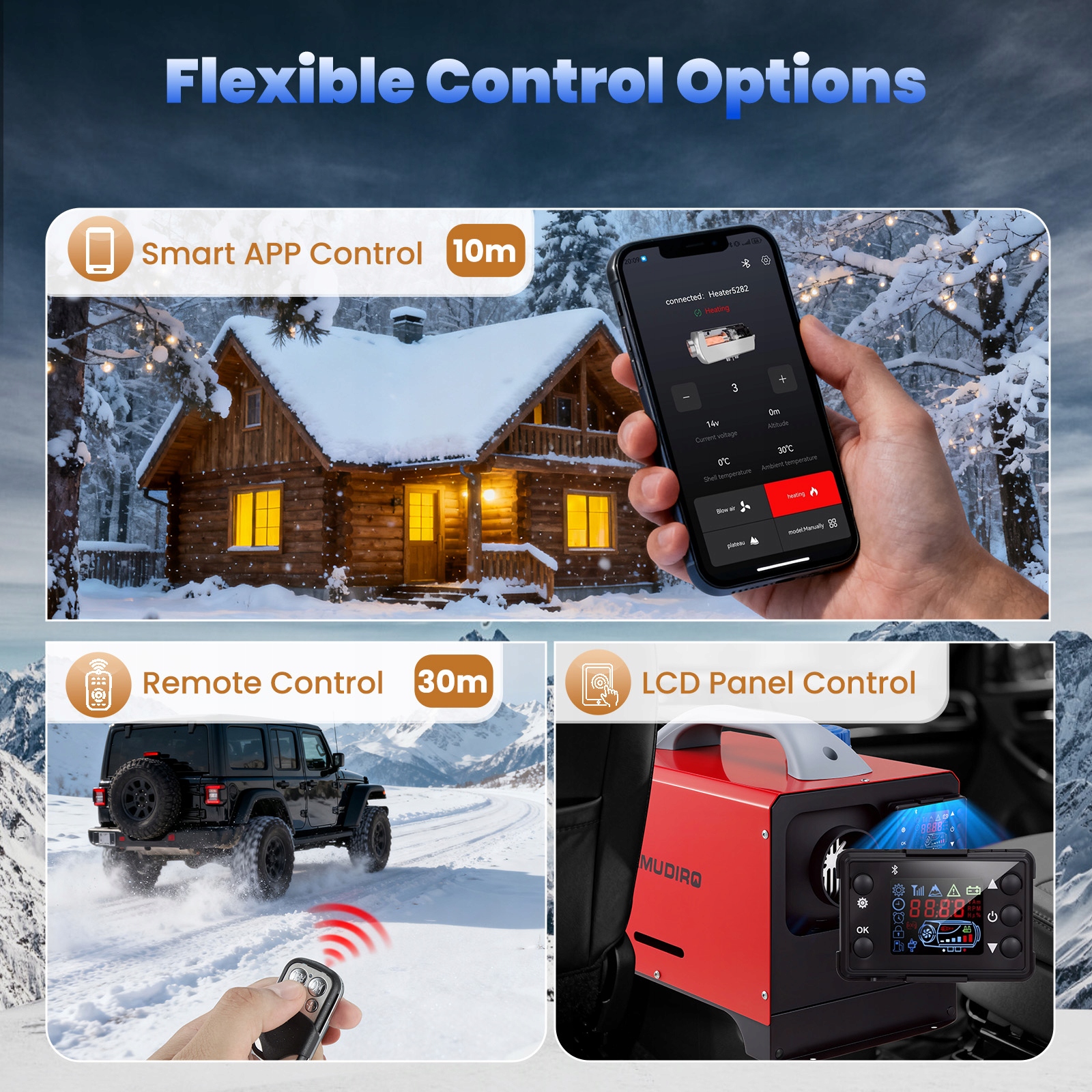 Цим дизельним обігрівачем 12 В можна керувати віддалено через Bluetooth (30 метрів), віддалено через пульт дистанційного керування та РК-панель трьома різними способами відповідно до ваших потреб; Інтелектуальний додаток також дозволяє встановлювати температуру, встановлювати час, встановлювати передачу, режим висоти, автоматичний старт-стоп, режим вентилятора та інші функції для забезпечення безперервного нагріву та економії часу.