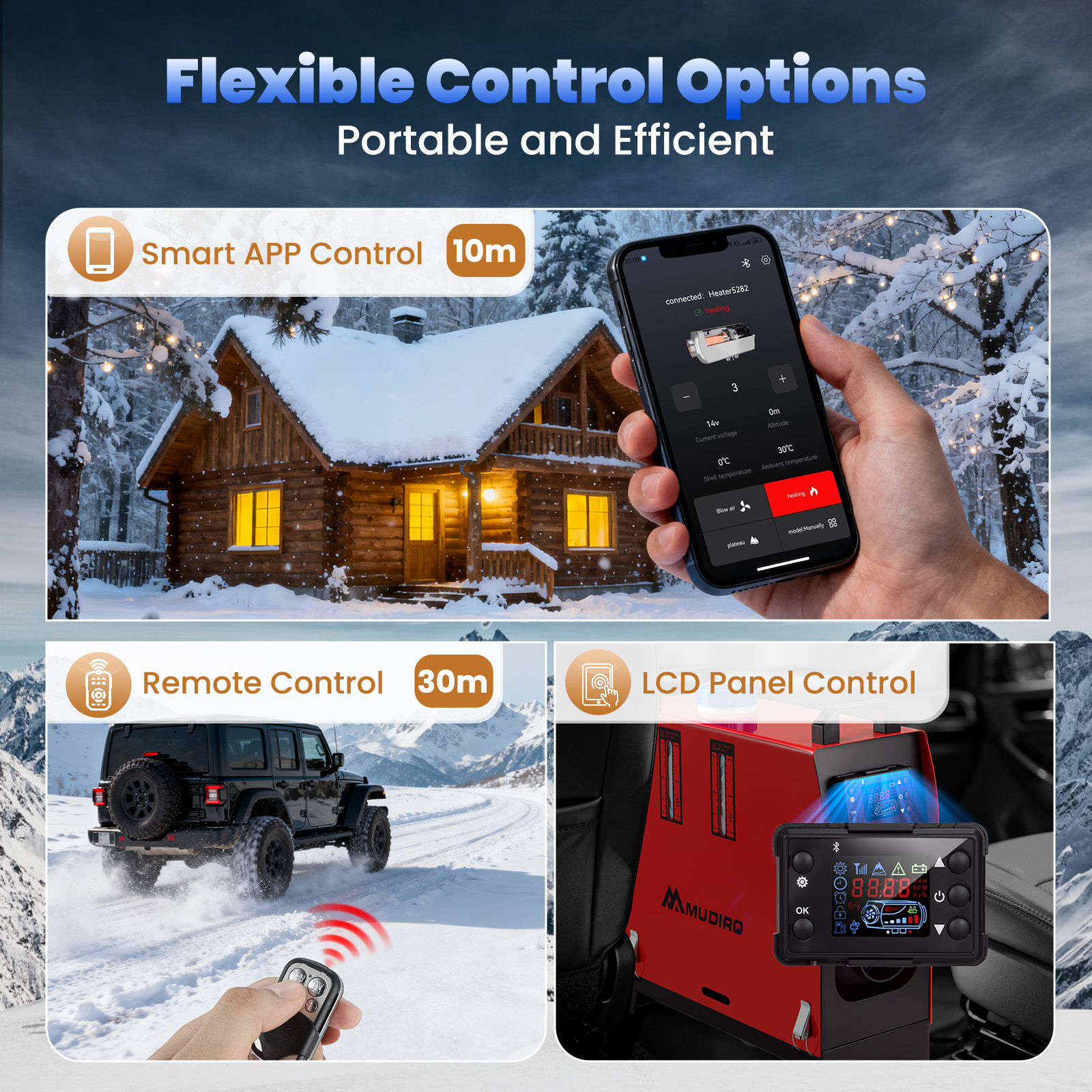 Цим дизельним обігрівачем 12 В можна керувати дистанційно через Bluetooth (30 метрів), дистанційне керування та РК-панель трьома різними способами відповідно до ваших потреб; Інтелектуальний додаток також дозволяє встановлювати температуру, встановлювати час, встановлювати передачу, режим висоти, автоматичний старт-стоп, режим вентилятора та інші функції для забезпечення безперервного нагріву та економії часу.