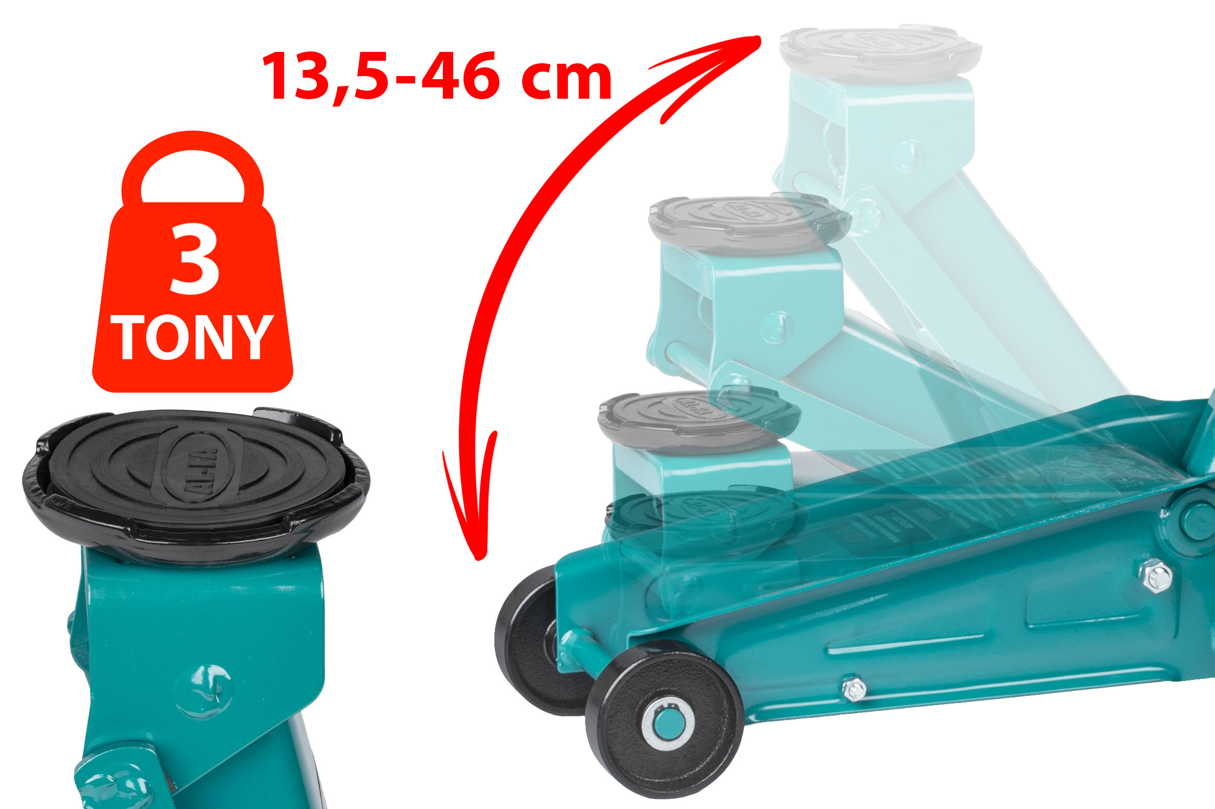 - Діапазон підйому 135 мм дозволяє підсунути його під стандартні легкові автомобілі, але це не низькопрофільна модель — не рекомендується для дуже низьких транспортних засобів.