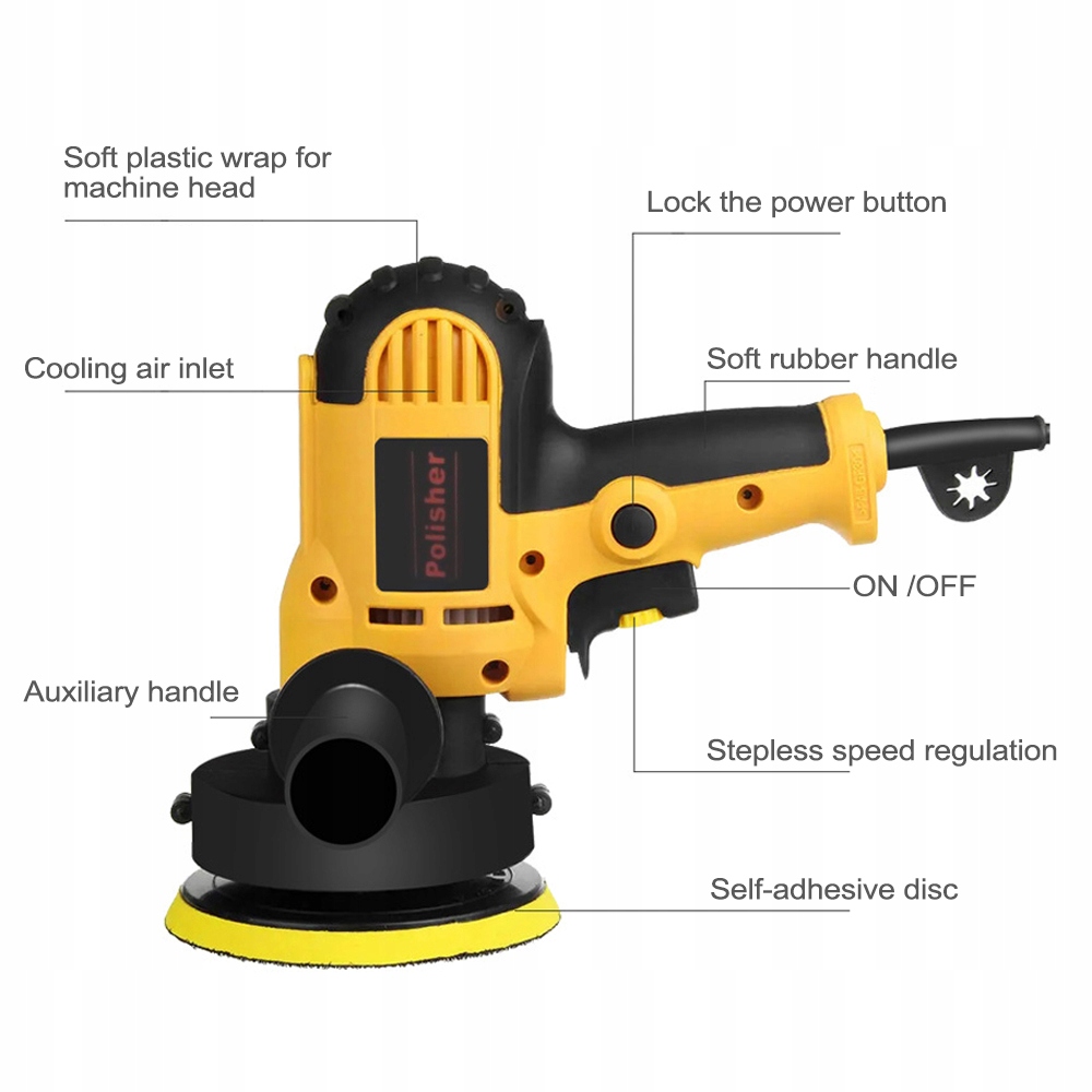 - Це різновид полірування автомобіля з високою якістю, високою швидкістю, низьким рівнем шуму, високою міцністю та забезпечує тривалий час служби. Конструкція тепловипромінювальних отворів з ефектом теплового випромінювання. Конструкція з регульованою швидкістю, її можна регулювати на різні швидкості для задоволення різних потреб. Знімна ручка, різьбовий стрижень, ергономічний, зручний і економічний, дуже практичний. Підходить для автомобілів, вощіння підлоги, зачистки металу, вощення меблів тощо.