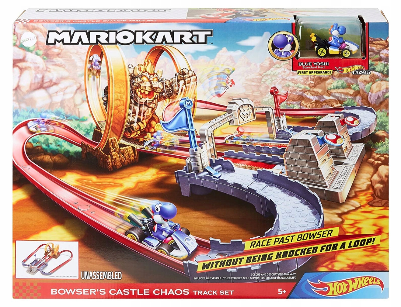 Відчуйте динамічні пригоди з Маріо та його друзями на гоночному треку Фортеці Маріо Карт Боузера. Щоб перемогти суперника, ви повинні пройти 5 кіл на трасі, не випадаючи. Уникайте кулаків Боузера і будьте першим, хто досягне місця призначення. Гоночний трек Bowser's Hot Wheels Mario Kart Fortress із подвійними петлями, де ви можете мчати пліч-о-пліч. Включає одну машину Yoshi.