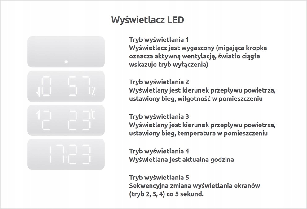 Світлодіодний дисплей, розташований у нижній частині вентилятора, надає користувачам важливу інформацію про пристрій та навколишні умови, як-от рівень вологості, температура повітря, швидкість вентилятора (швидкість), потік повітря напрямок, час, що залишився до вимкнення пристрою (якщо встановлено ТАЙМЕР), а також поточний час.