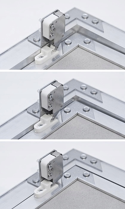 Виготовлені з алюмінієвих профілів і водонепроникної стулки товщиною 12,5 мм, оснащені міні-засувними пружинними засувками, завдяки яким двері відкриваються і закриваються після натискання на них. Передня частина люка виконана з гіпсокартону і може бути покрита фарбою, завдяки чому ревізійний отвір непомітно вписується в естетику приміщення. Клапани випускаються понад 20 розмірів від 150 x 150 мм до 600 x 600 мм. Клапан не підходить для кріплення на його поверхню керамічної плитки.