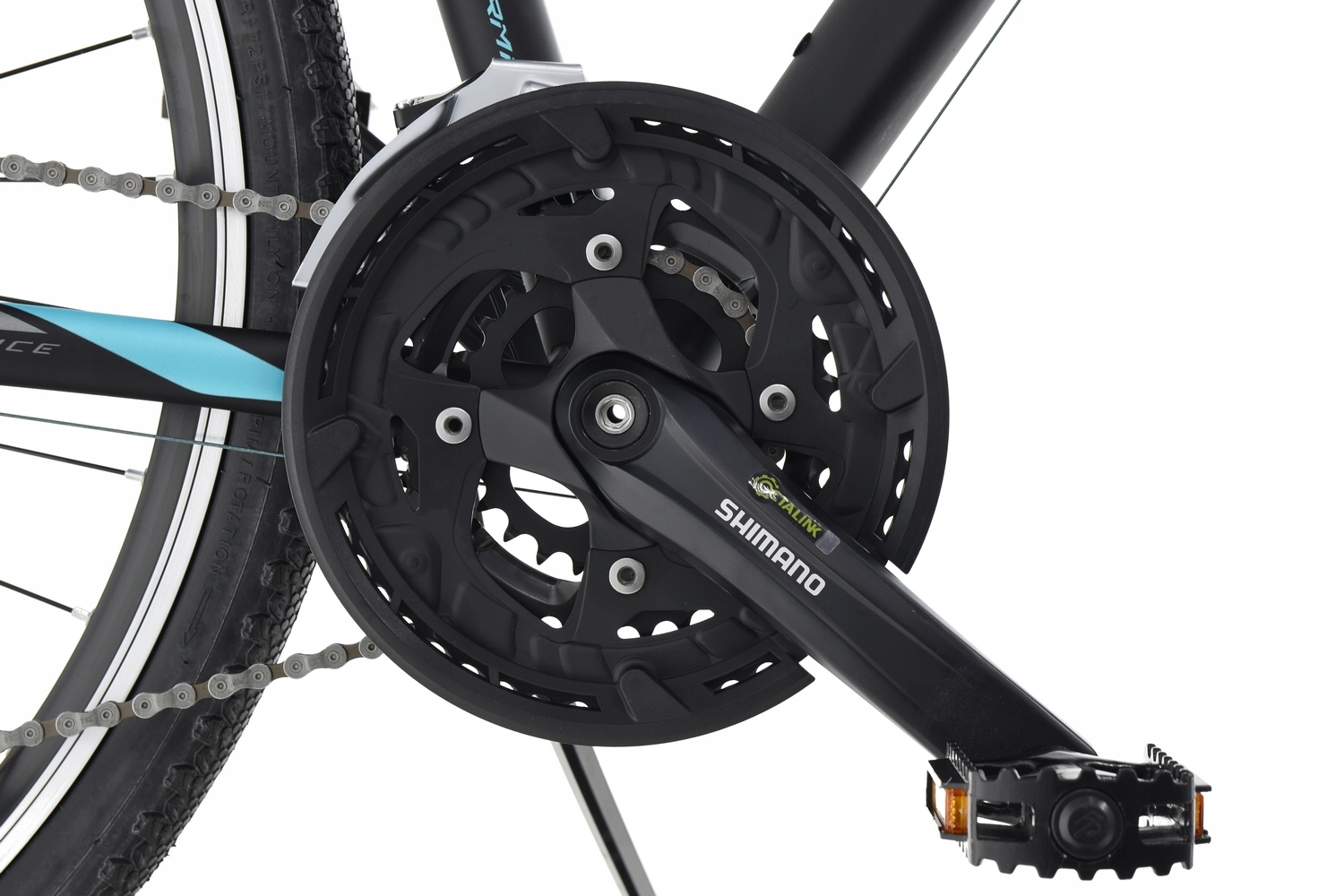 Надійний алюмінієвий шатун SHIMANO FC-TY4010 із довжиною плеча 175 мм. Оснащений трьома зірочками з кількістю зубів 48/36/26 для найнижчої зірочки, що забезпечує правильну роботу ланцюга. Призначений для приводів 3x9 і плавного та надійного перемикання передач на складній місцевості завдяки системі HyperDrive. Була використана вставка типу Octalink, для порівняння потужність, що передається на 8-шліцеву вставку OCTALINK зі звичайними квадратними шліцами, збільшує жорсткість всієї конструкції. Шатун має змінні верхи.