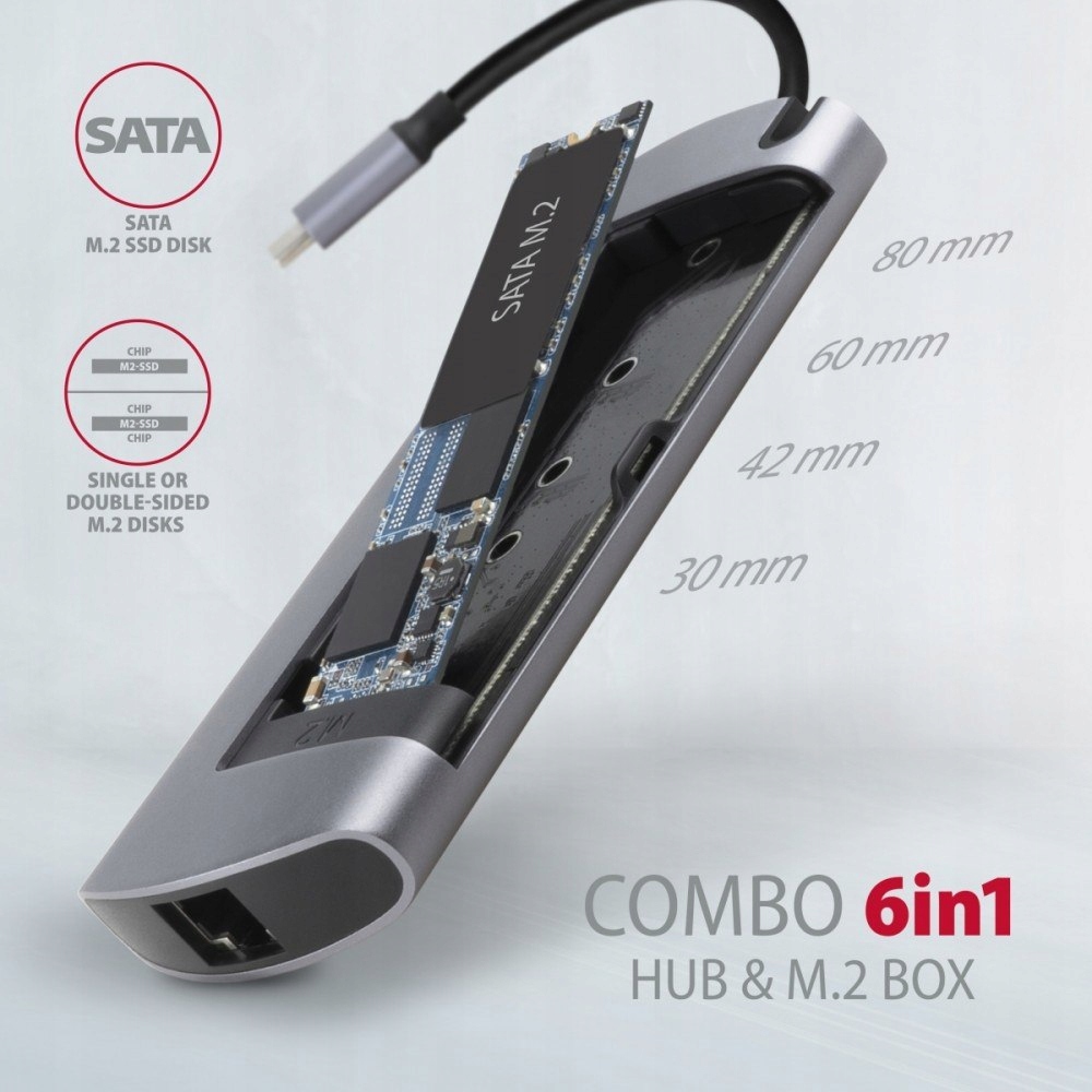 Многопортовий концентратор AXAGON HMC-6M2 USB-C 3.2 Gen 1, слот M.2 SATA + HDMI + GLAN + 2x USB-A + PD 100 Вт