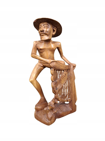Дерев'яна скульптура, що зображує азіата, який тримає в руках сітку з рибою.