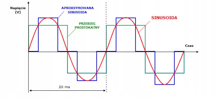 SINUS виробляють на виході синусоїдну змінну напругу, ідентичну напрузі в електромережі. Перетворювач дозволяє живити пристрої, оснащені електродвигунами і трансформаторами, такі як електроінструменти, насоси, побутову техніку малої і середньої потужності. Типові дешеві перетворювачі фактично виробляють прямокутну напругу, яку часто неправильно називають "модифікованою синусоїдою", яка не підходить для живлення індуктивних або ємнісних пристроїв і може їх пошкодити.
