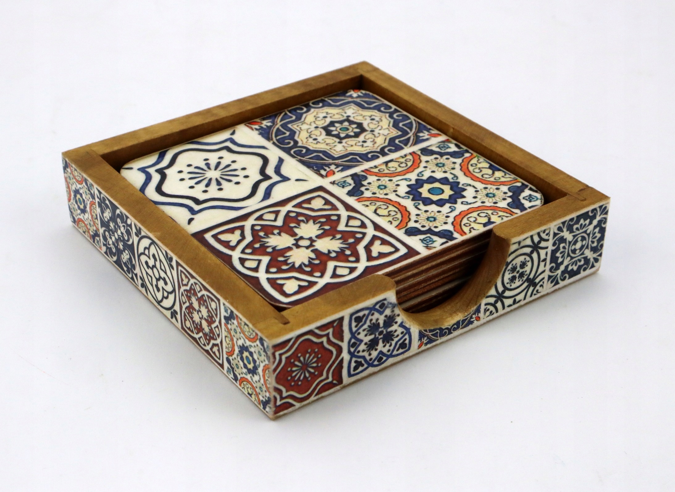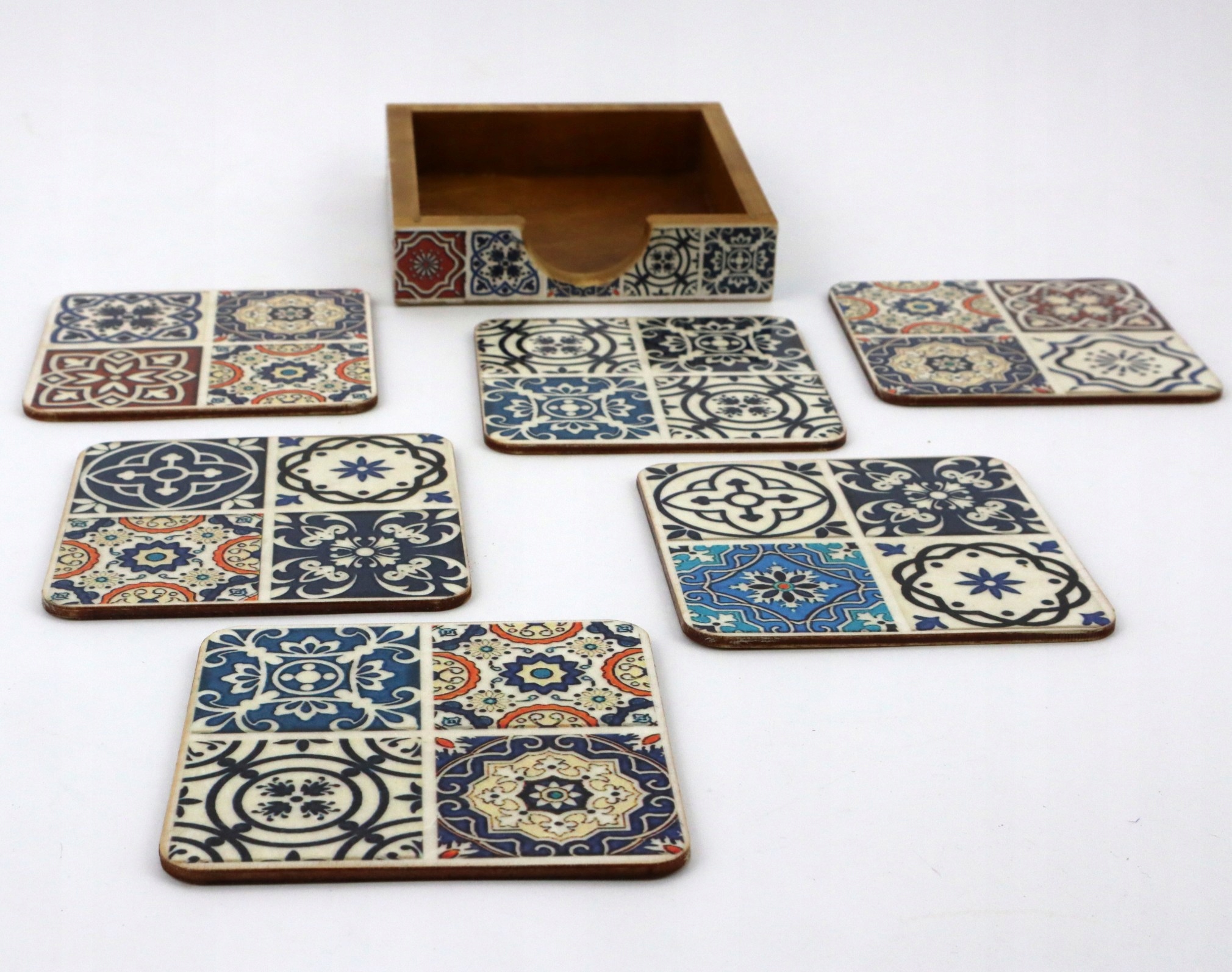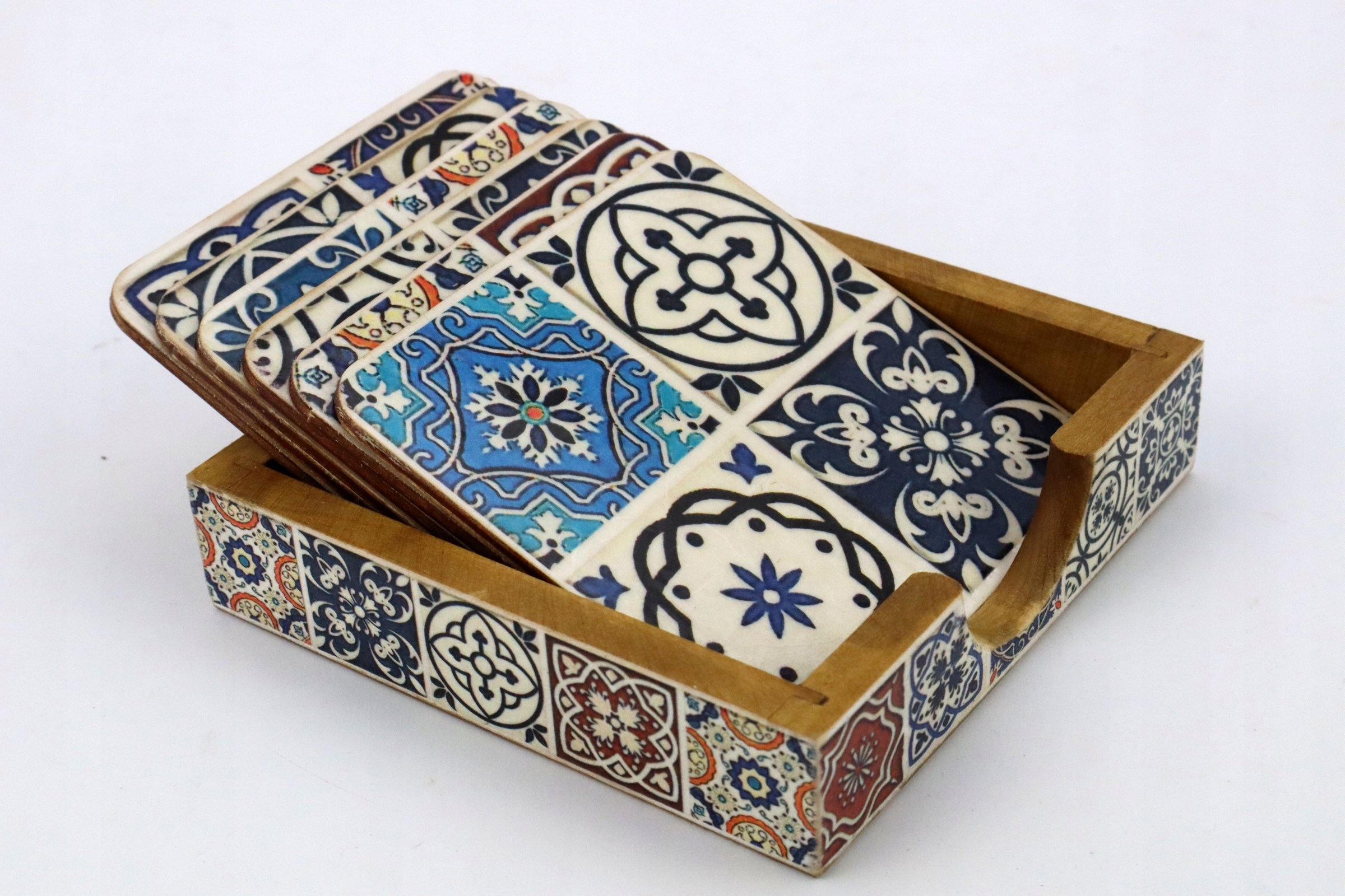Цей набір складається з 6 дерев’яних підставок, які ідеально підходять для використання під кухлями, кухлями чи свічками, і відкритої дерев’яної коробки.