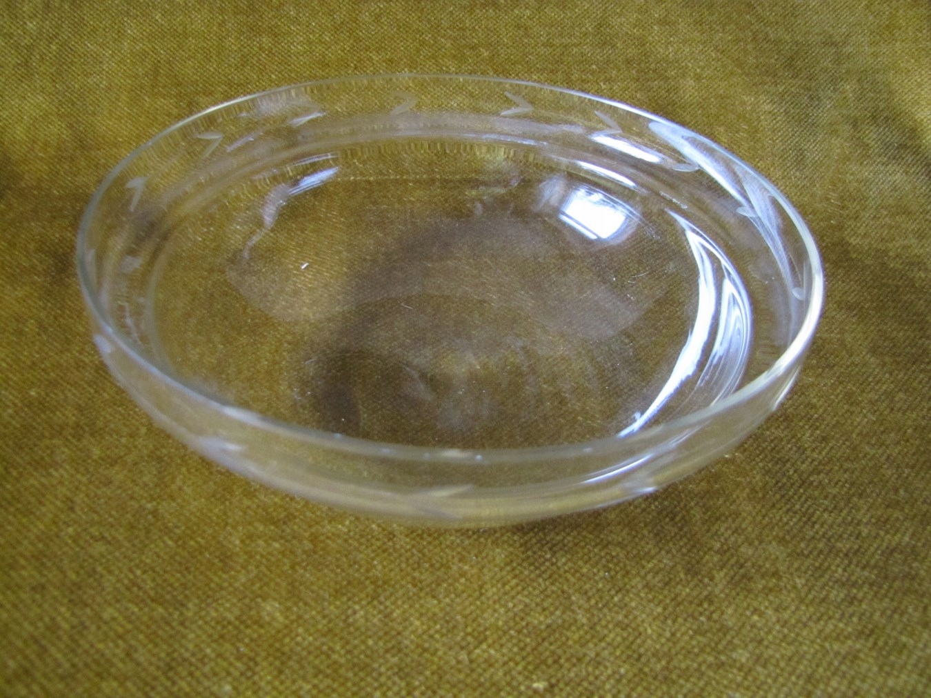 Скло видно на фотографіях, єдине пошкодження - це невелика втрата скла, яка видно на фото № 6. Діаметр, зовнішній верхній край 19,5 см. , загальна висота 7,5 см, висота пластини до коміра 5 см. , діаметр скла під коміром 16 см.
