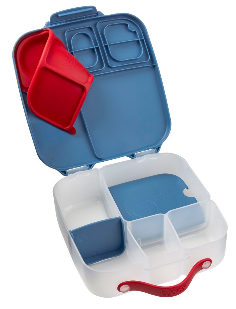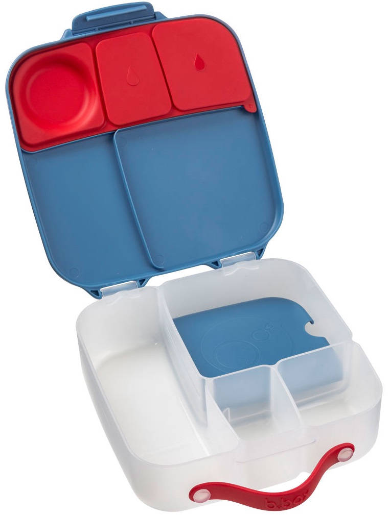 Великий ланчбокс b.box — функціональний і зручний продукт. Є зручна ручка для перенесення. Затискач добре тримається і легко відкривається навіть для дошкільнят. Прати також легко. Немає важкодоступних куточків, рухливі перегородки знімаються, силіконовий ущільнювач на кришці знімається. Завдяки цьому ви зможете швидко та ретельно вимити та висушити ланчбокс. Ви також можете поставити коробку з продуктами в холодильник.