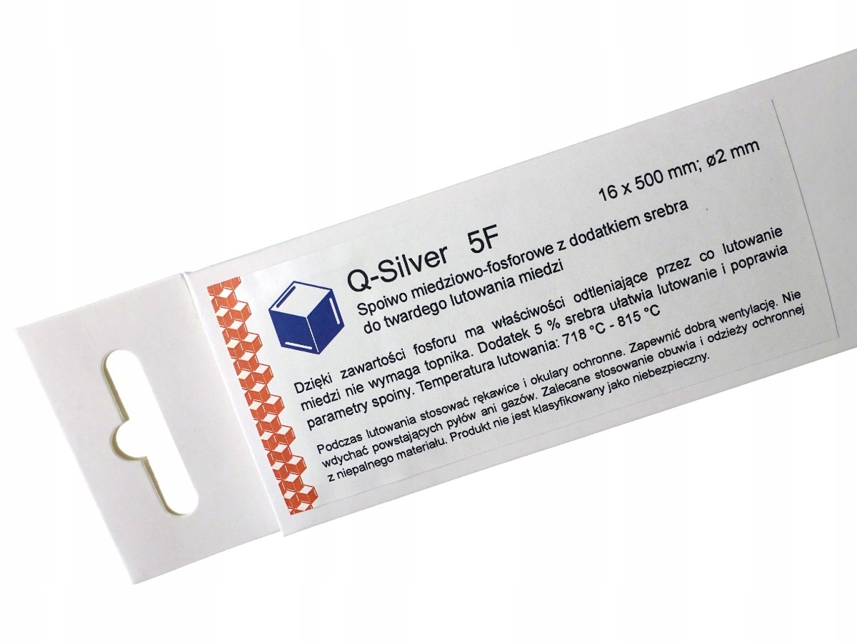 Срібна сполучна речовина, призначена для пайки. Сплав має властивості розкислення, завдяки чому відмінно змочує поверхню міді без використання флюсу. Завдяки цьому стик не вимагає чищення. Вміст срібла (5%) полегшує пайку і покращує параметри зварювання. Сполучна речовина Q-Silver 5F використовується для капілярної пайки мідних установок (наприклад, опалювальних, сонячних), а також у системах охолодження та кондиціонування повітря. У пропозицію входить оригінальна упаковка, яка містить 16 паличок діаметром 2 мм і довжиною 500 мм.