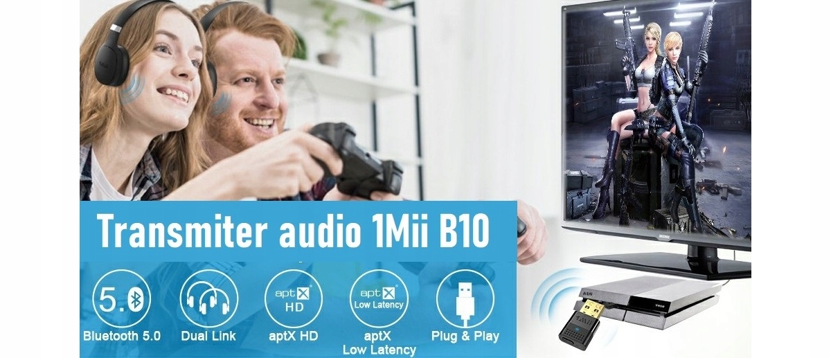 Модель B10 — це невеликий і компактний пристрій, який служить USB-передавачем аудіо. Просто підключіть їх до USB-порту вашого комп’ютера з Windows або Mac, і операційна система встановить їх серед ваших аудіопристроїв. 1Mii B10 дозволяє підключити два пристрої, які отримують аудіосигнали одночасно (наприклад, дві пари бездротових навушників). Пристрій підтримує професійні аудіокодеки, такі як aptX LL/HD. Використання новітніх компонентів гарантує велику дальність передачі та відсутність затримок у прийнятому сигналі.